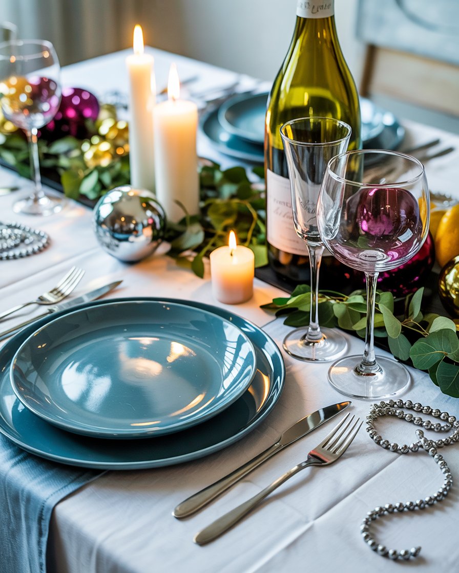 Pairing navy blue chargers with white linens gives you a crisp, contemporary vibe. Add random glass beads over the entire table for some sparkle. It is one of those,”I-don’t-have-to-try-so-hard ideas,” especially fitting in a minimalist home. For 2025, Architectural Digest trend forecasters look for deep jewel tones like sapphire blue to be on high demand in winter styling.