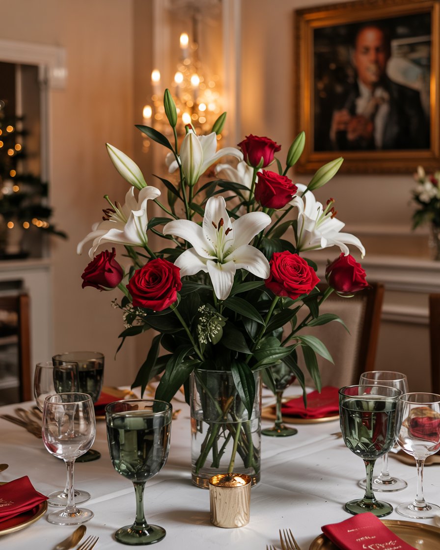 Start January off with grand florals of white lilies and red roses. It is an oversized countdown clock, such that nothing else big need adorn the table. Celebrity planner Mindy Weiss is always noted in the wedding design community for saying oversized floral décor gives an instant upgrade to even the simplest party table.