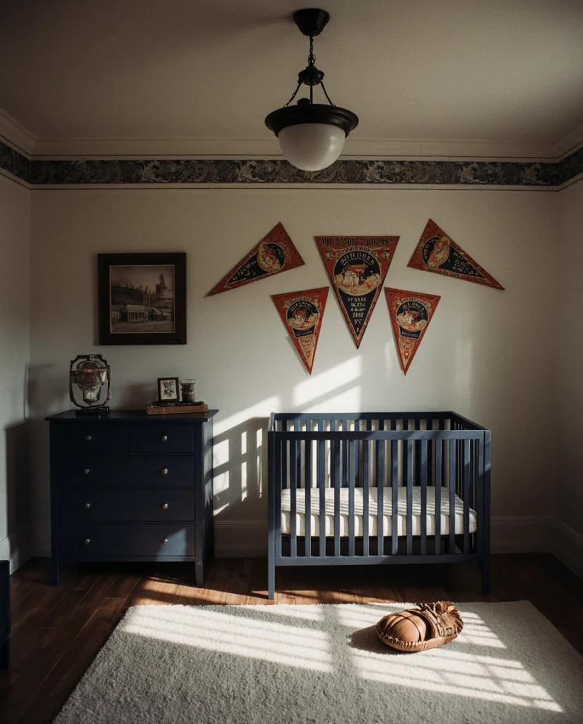 For athletic families, a room with sports nursery ideas blends team pride with playful design through vintage pennants, leather accents, and a locker-room-inspired palette. Navy, brown, cream, and pops of team colors create a spirited yet sophisticated space. This theme works especially well in homes where sports are central to family culture—think Texas football towns, baseball-loving suburbs, or basketball-centric cities. The key is keeping it tasteful and avoiding an overly commercial look by using vintage or retro sports imagery rather than current team branding.