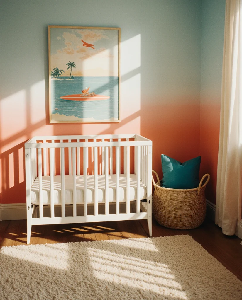 One San Diego mom shared that she found a vintage surfboard at a garage sale for twenty dollars and mounted it above the crib as statement art—it became the room’s focal point and conversation starter. This theme works best when you embrace retro graphics and bold shapes but keep the overall palette soft and beachy. Common mistake: using too many neon or primary colors, which can feel chaotic; instead, opt for faded, sun-bleached tones that feel authentically vintage.