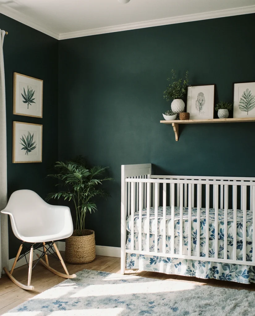 This palette thrives in rooms with good natural light, where the greens and blues shift subtly throughout the day. One practical tip: use varying shades of both colors—from seafoam to navy and sage to emerald—to create depth and visual interest without needing bold patterns. Many parents find that adding live plants not only enhances the nature theme but also improves air quality, making the room healthier for baby. Keep accessories simple to let the calming palette do the work.