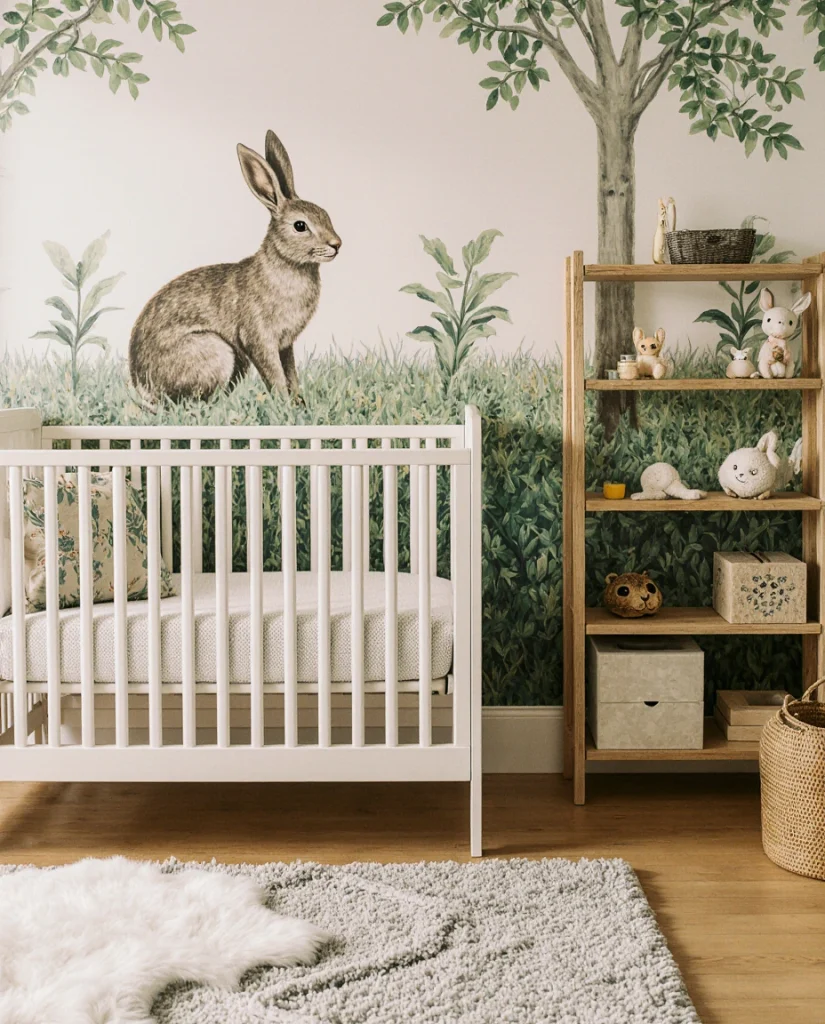 One Oregon mom shared that she commissioned a local artist to paint a simple bunny scene on one wall for under two hundred dollars, creating a custom focal point that feels special and unrepeatable. This theme works best when you keep the bunny imagery soft and illustrative rather than cartoonish. Avoid mass-produced character bedding; instead, look for artisan prints on Etsy or hand-stitched bunny toys that feel more heirloom than trend.