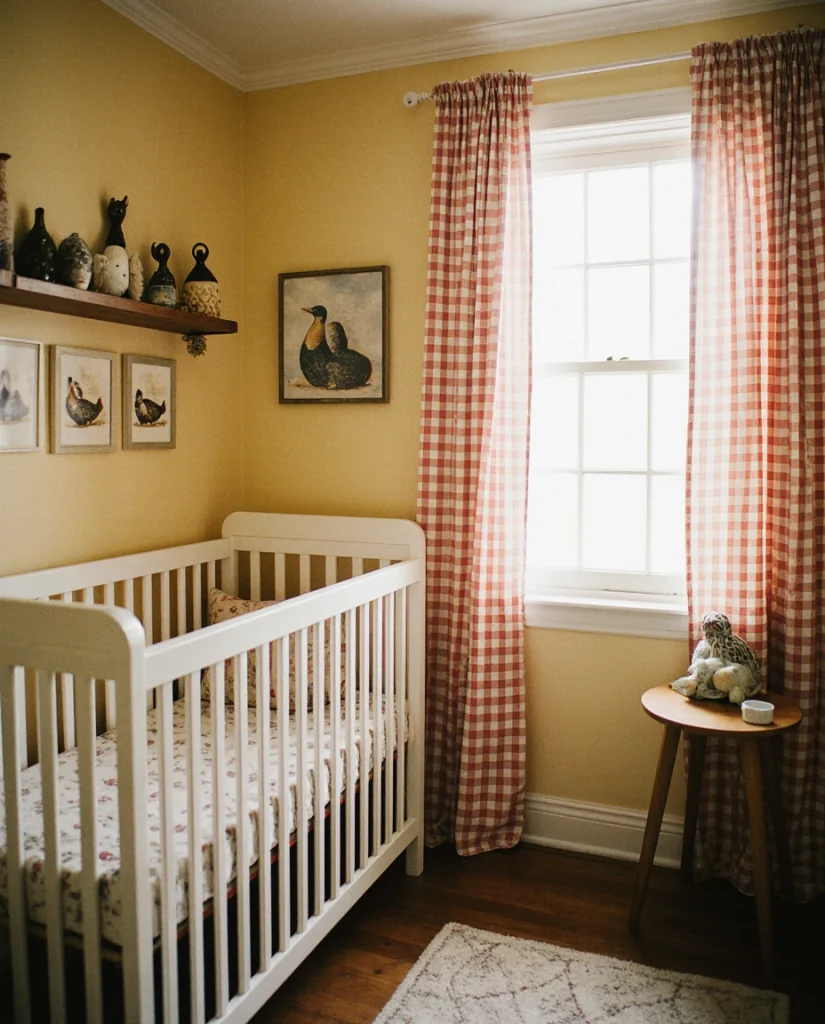 This theme works particularly well when you source authentic vintage duck prints and decoys from antique shops or online marketplaces—real pieces add character that reproductions can’t match. One Midwest parent noted that framing her grandmother’s old duck prints created a meaningful connection across generations. Budget tip: gingham fabric is inexpensive and easy to find; use it for curtains, crib skirts, or cushion covers to tie the look together affordably.