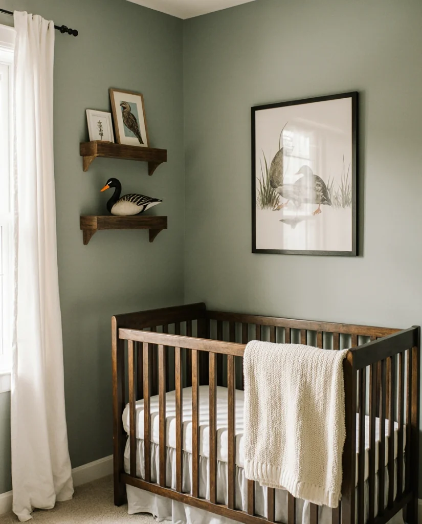 A duck hunting-themed nursery offers a quietly masculine elegance rooted in American waterfowl tradition. Soft sage greens, warm taupes, and hints of navy create a calming backdrop for vintage duck hunting prints, decoy-inspired toys, and woven baskets. This design appeals to families with ties to the South or rural communities where waterfowl hunting is a cherished pastime. It’s heritage-driven without being heavy-handed, blending nostalgia with nursery functionality in a way that feels both intentional and relaxed.