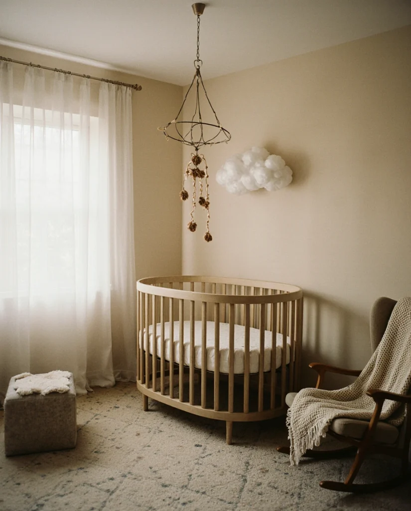 The soft 2000s aesthetic is making a comeback, blending creamy neutrals, organic shapes, and a Y2K-lite sensibility that feels fresh again. Think cloud mobiles, chunky knit blankets, and rounded furniture in warm beige and soft white tones. This style appeals to millennial parents who grew up in that era and want to recreate its optimism without the harsh minimalism. It’s particularly popular in urban and suburban settings, where calming, Instagram-ready spaces are prized for both function and aesthetic.