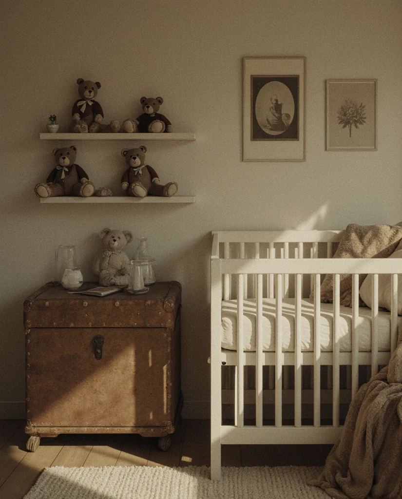 A vintage teddy bear theme brings warmth and whimsy through antique bears, sepia-toned prints, and nostalgic toy displays. Soft browns, creams, and muted golds dominate the palette, evoking early 20th-century childhood charm. This design resonates with families who appreciate heirloom pieces and storytelling through objects. It’s especially popular in homes with a love for antiques or those located in historic neighborhoods where vintage finds are easy to source. The result is a nursery that feels tender, collected, and rich with history.