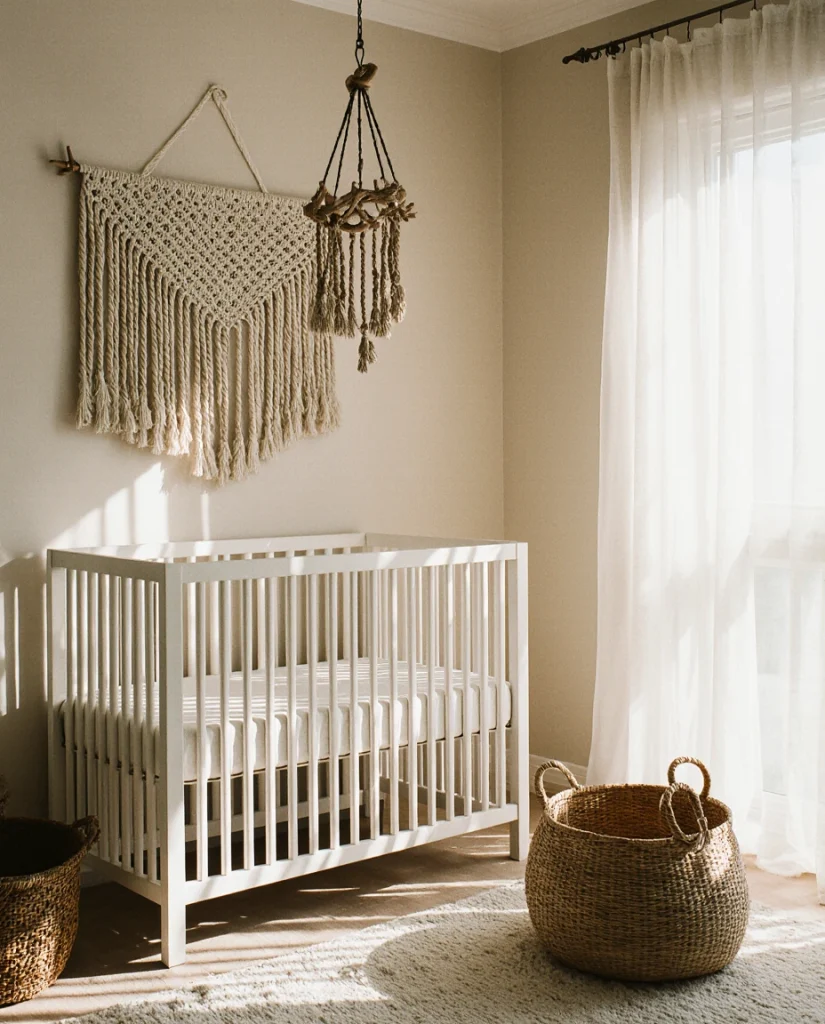 The boho beach nursery merges coastal calm with bohemian texture, featuring natural fibers, driftwood accents, and a sandy, seafoam palette. Macramé wall hangings, woven baskets, and linen textiles create a relaxed, organic vibe perfect for families near the coast or those who dream of oceanside living. This style has surged in popularity across California, Florida, and the Carolinas, where beach culture influences everyday design. It’s laid-back, breathable, and endlessly soothing—a natural fit for a baby’s first room.