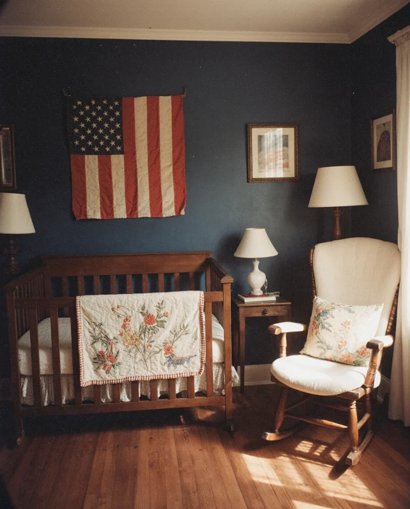 A vintage American nursery celebrates Americana through antique flags, rustic wood furniture, and a red, cream, and navy palette. Think vintage maps, hand-stitched quilts, and folk art that tells a story of American craft and tradition. This theme appeals to families with deep roots in American history or those who appreciate the handmade, heritage aesthetic. It’s particularly popular in the South and rural communities where family history and regional pride run strong. The look is warm and patriotic without being overt and rich with narrative.
