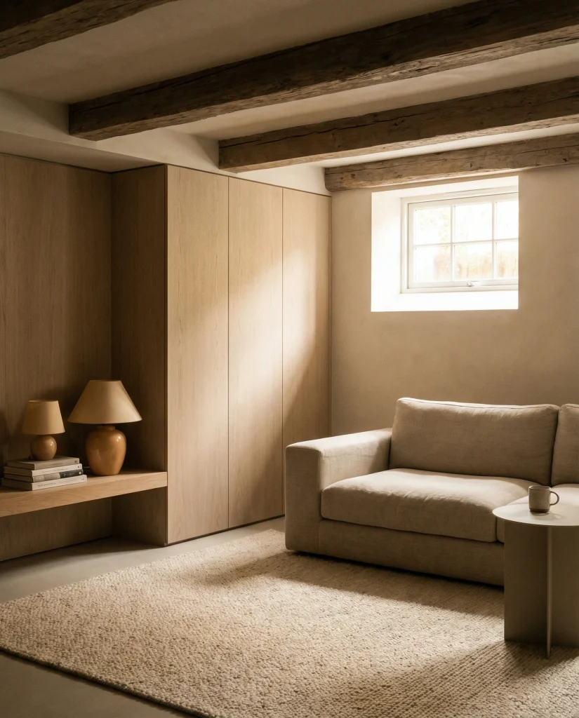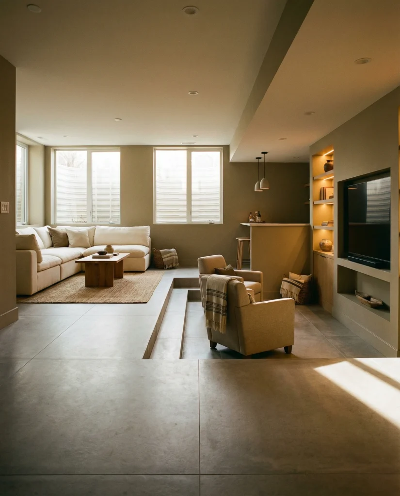 A warm minimalist retreat works beautifully in basements with low ceiling height and a need for storage solutions. By keeping the palette simple and the lines clean, the space instantly feels more open. Soft lighting, calm neutrals, and a streamlined layout make even compact rooms feel intentional.