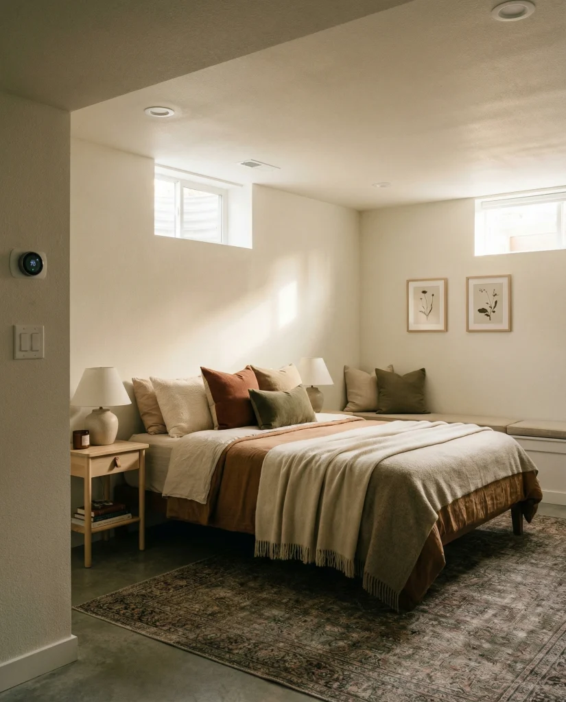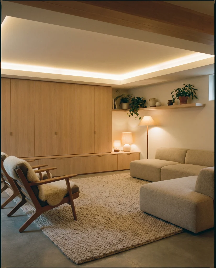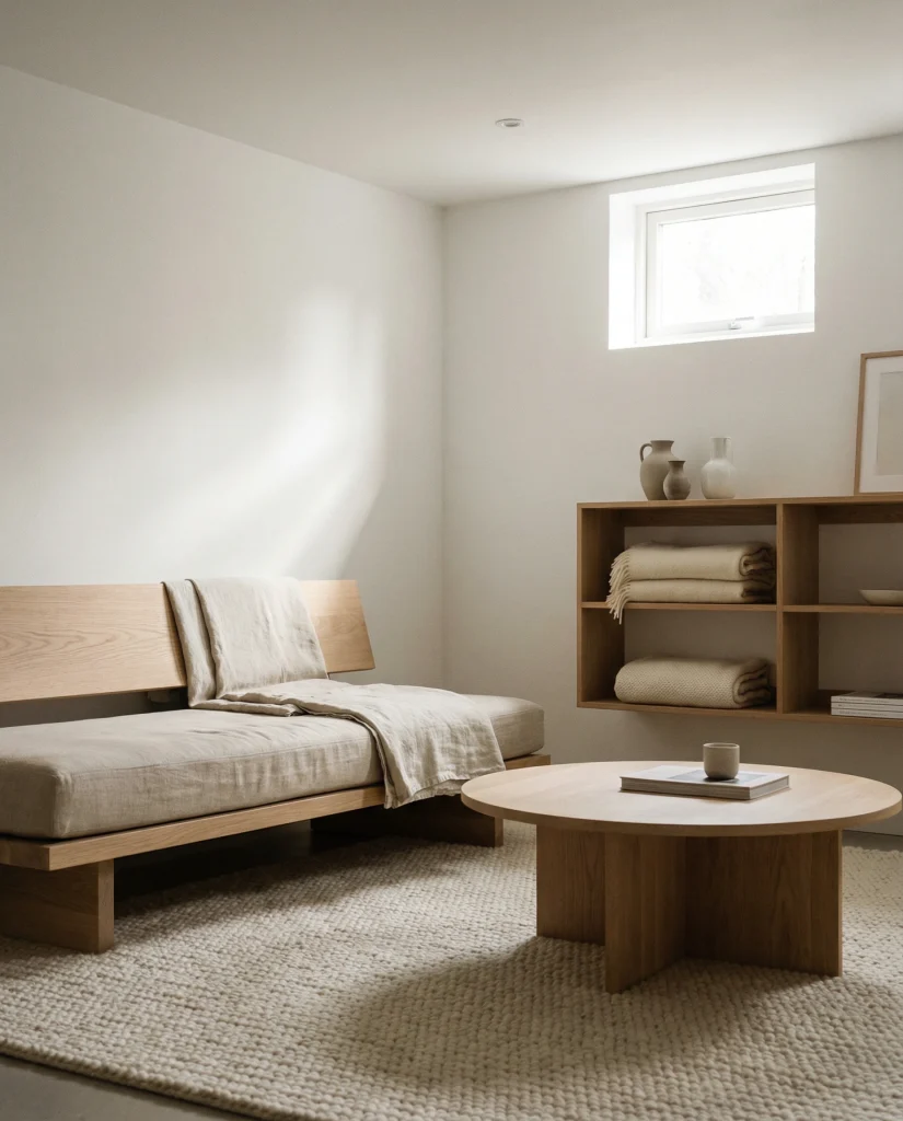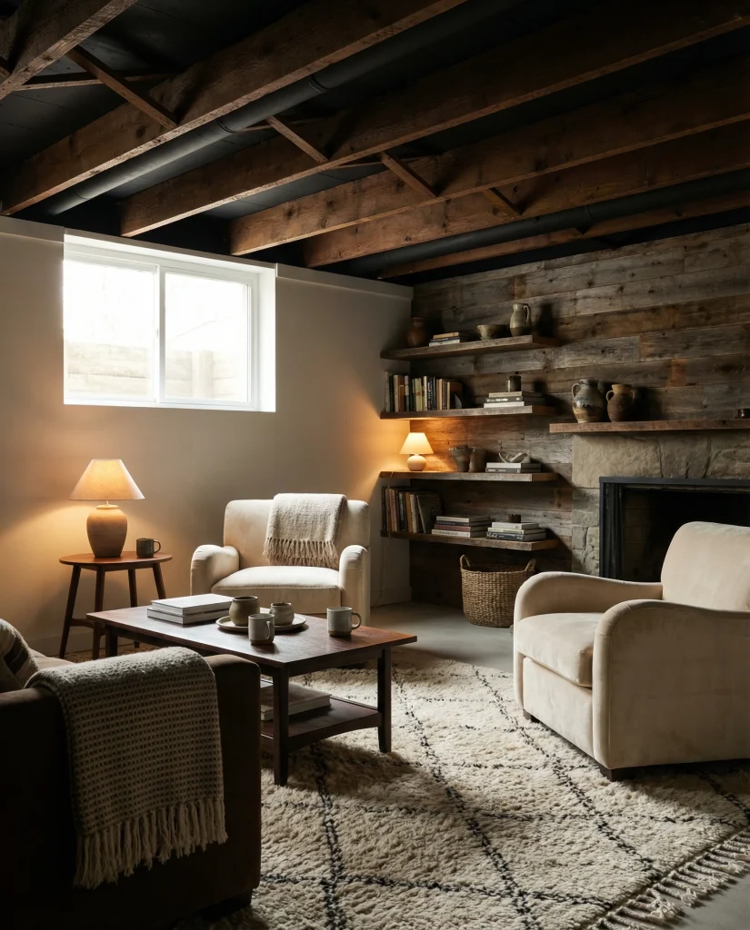 American lifestyle context: Many households use basements as multipurpose rooms, and the Scandinavian approach supports that flexibility. Its neutral palette easily adapts to kids’ toys, home office setups, or quiet reading corners without feeling cluttered.