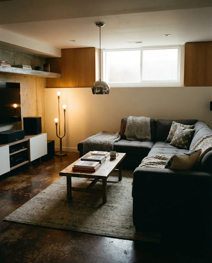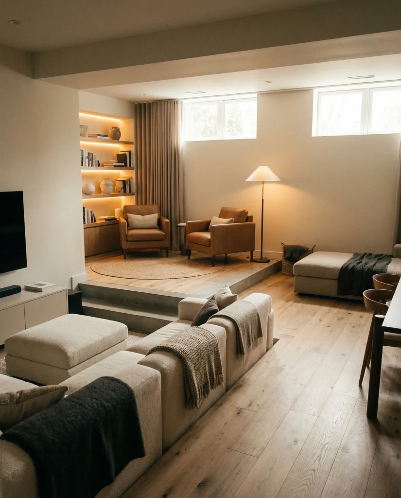 Practical insight: defining zones through lighting—task lamps for study, warm sconces for lounging—helps each area feel intentional. It also prevents the basement from reading as one big undefined room.