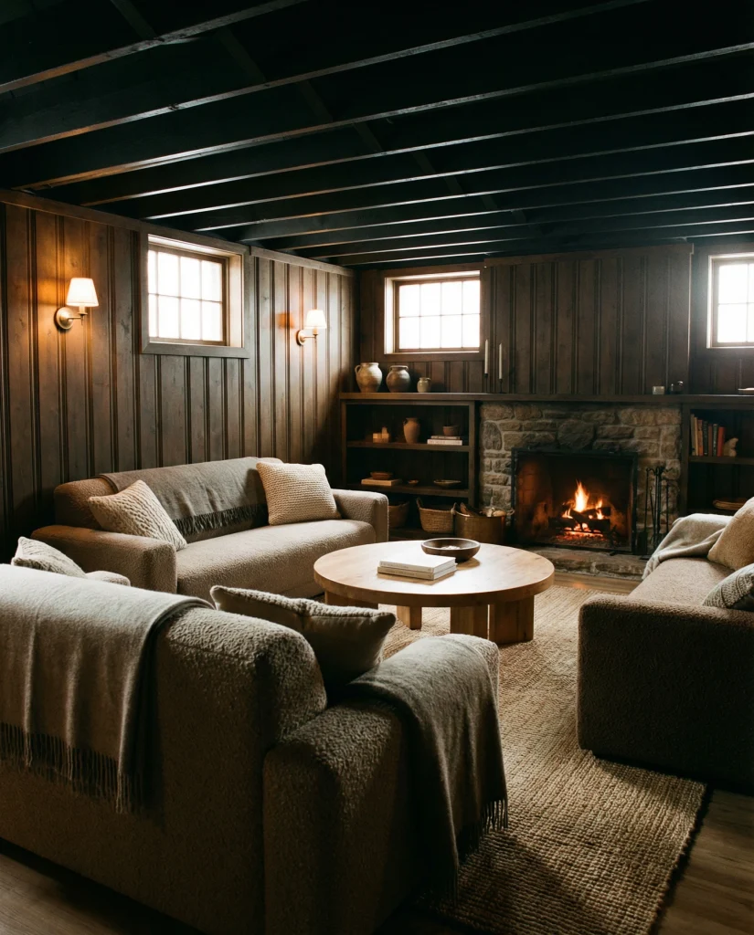 Turning a basement into a cozy speakeasy works beautifully with a black ceiling and warm ideas centered on ambient lighting. Velvet textures, brass accents, and dark woods create a transportive atmosphere. It’s a stylish escape tucked right under the main floor.