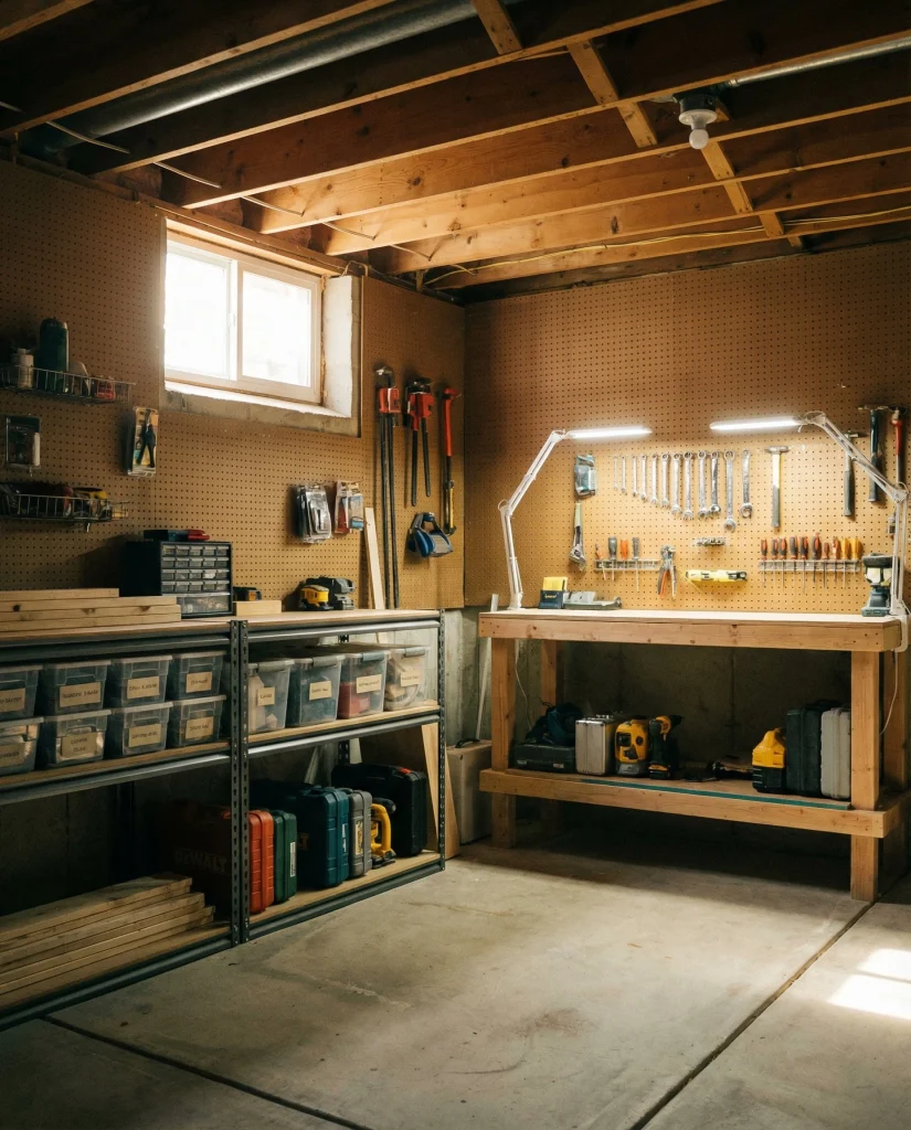The appeal of an unfinished workshop zone with some smart storage solutions is something many homeowners do not notice. Keeping the joists and concrete unsheeted is a no-cost design choice that adds character to the space. Tools can be easily stored and organized with pegboards, rails, and basic shelving without adding confusion to the design.