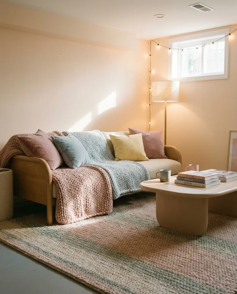 Soft color palettes combined with a budget approach turn a darker basement into a gentle, inviting hangout. Dusty blues, blush pinks, and creamy beiges add warmth without closing in the space. Layered textures and warm lighting complete the look.