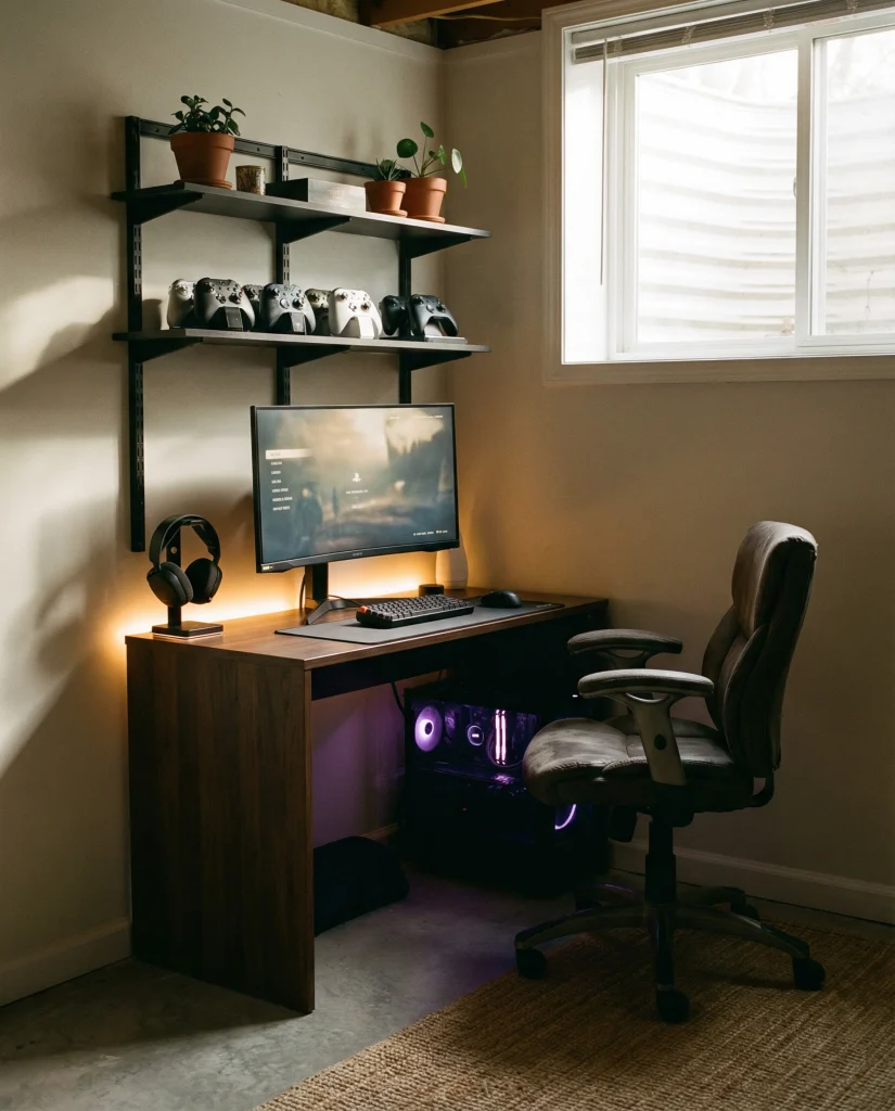 Transforming a small alcove into a gaming corner works beautifully when using cheap décor ideas and practical, easy updates. LED strips, a compact desk, and mounted shelves keep the setup organized and expressive. Dark accents add focus without requiring a full remodel.