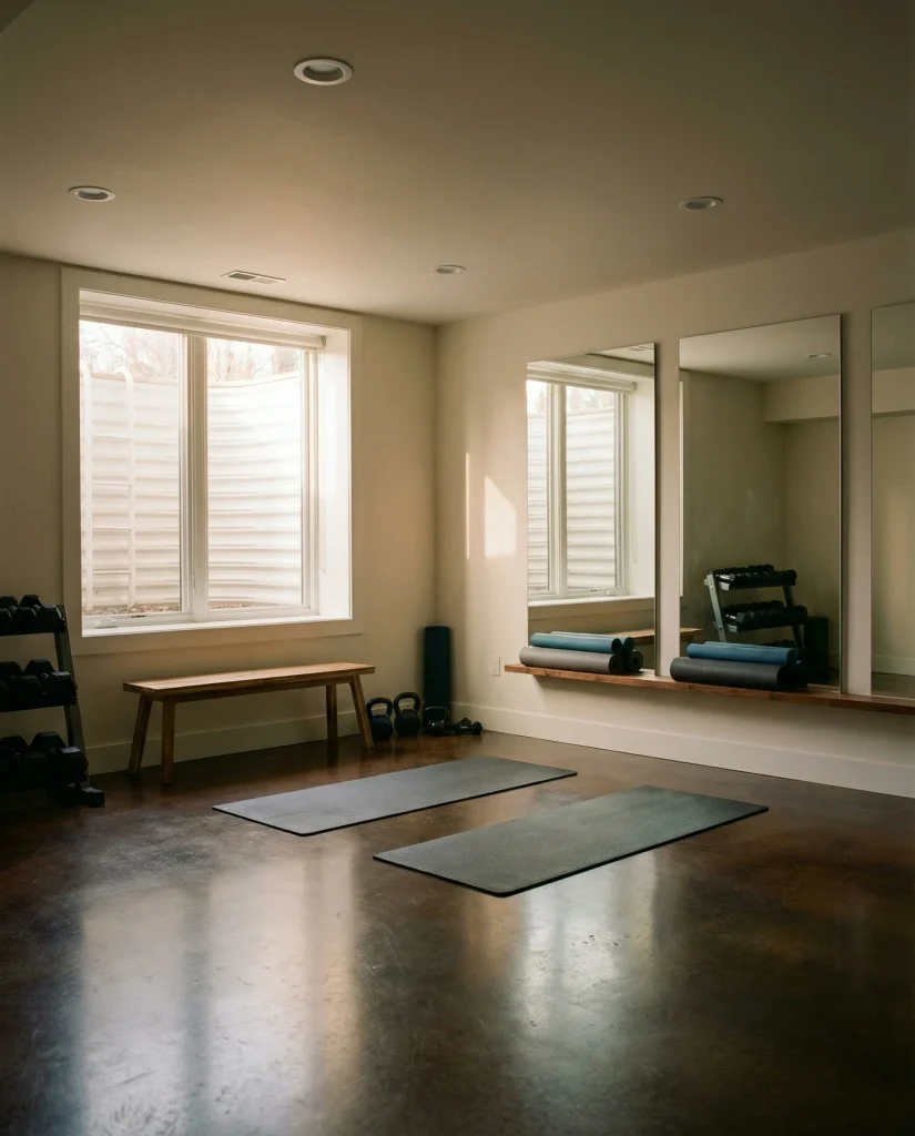 A fitness area built around ideas with stained concrete floors stays clean, modern, and moisture-friendly. Adding mats, mirrors, and streamlined storage helps the room adapt from yoga to strength workouts. Clean lines and minimal décor keep the space motivating.