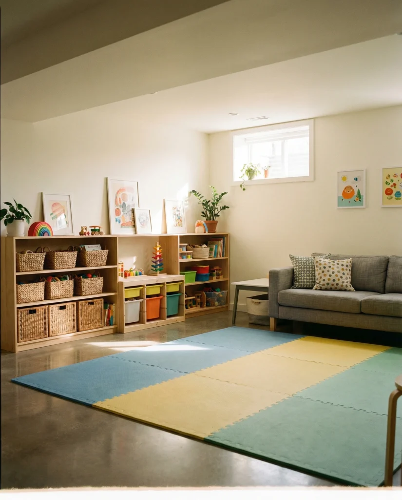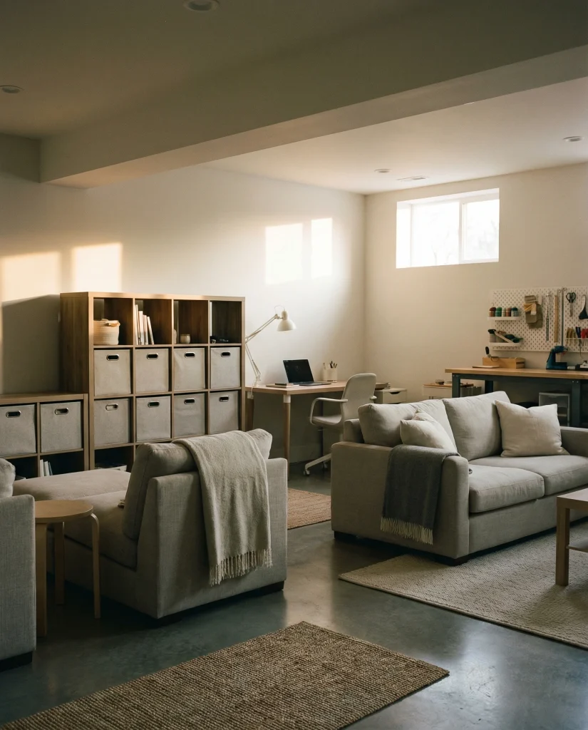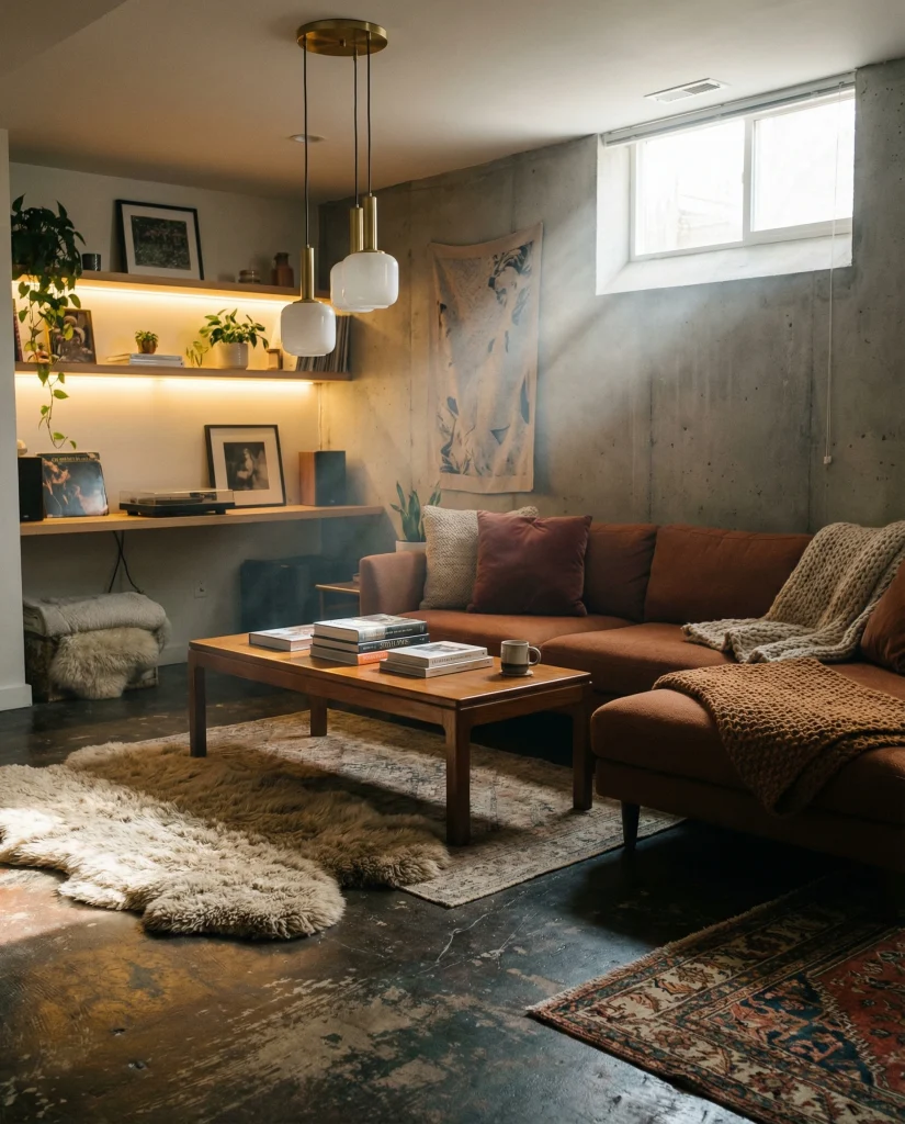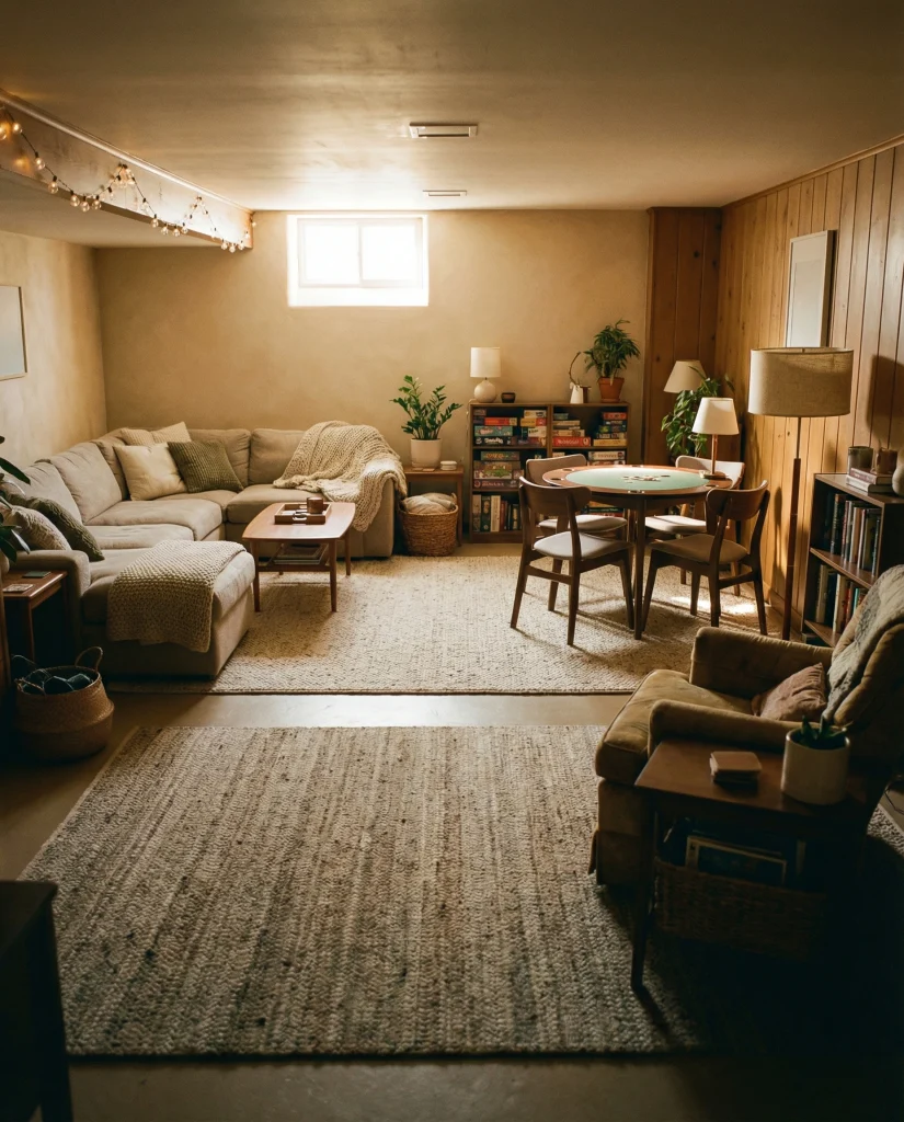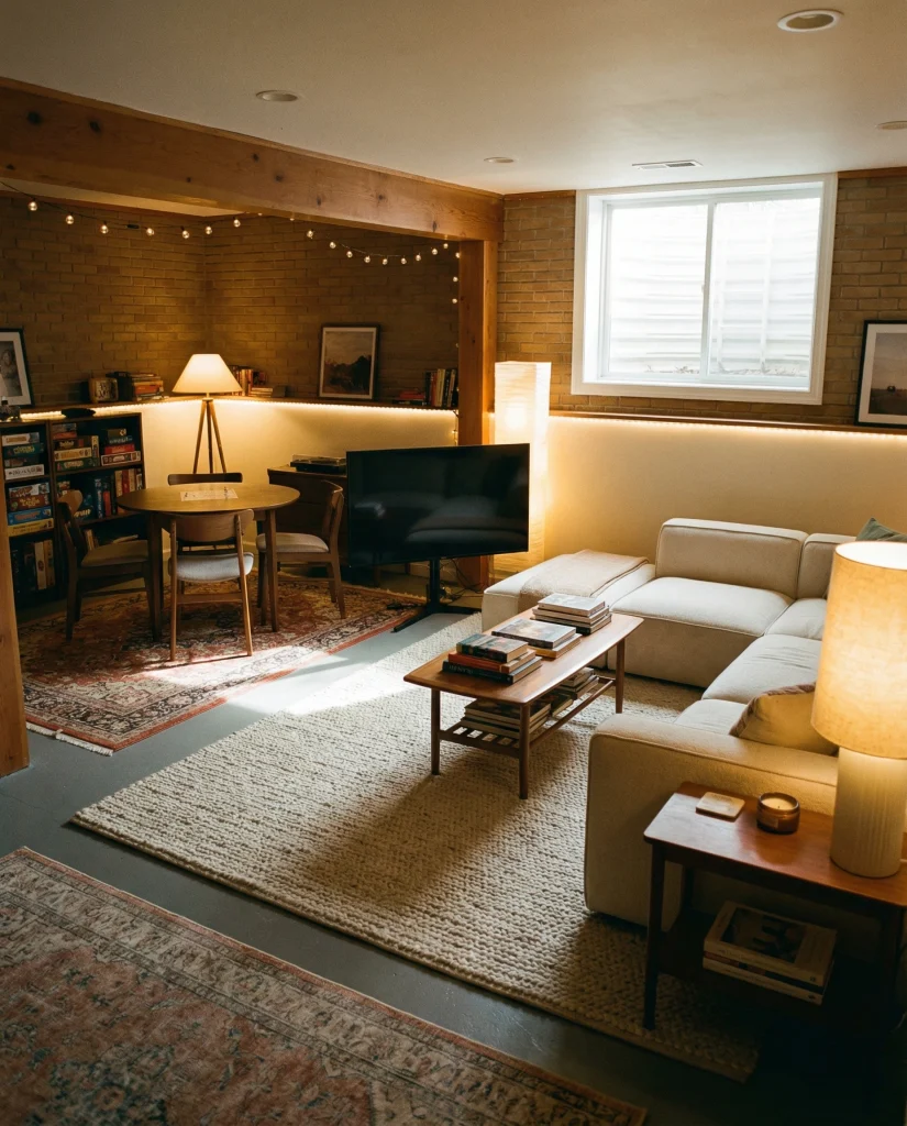 A multi-zone layout brings versatility to basements using ideas of layout and affordable furnishings. One corner becomes a study nook, another a lounge, and a third a craft or kids’ zone. Soft dividers and rugs help mark the boundaries without building walls.