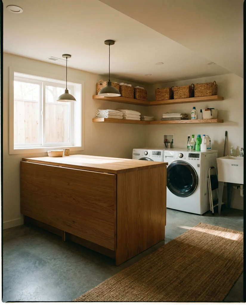 A laundry zone thrives on DIY projects paired with storage solutions that streamline the workflow. Floating shelves, labeled baskets, and a countertop over appliances create instant order. Even small basements gain clarity when everything has its place.