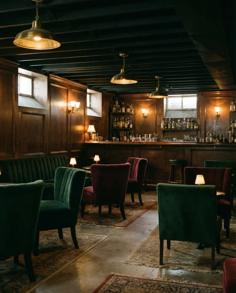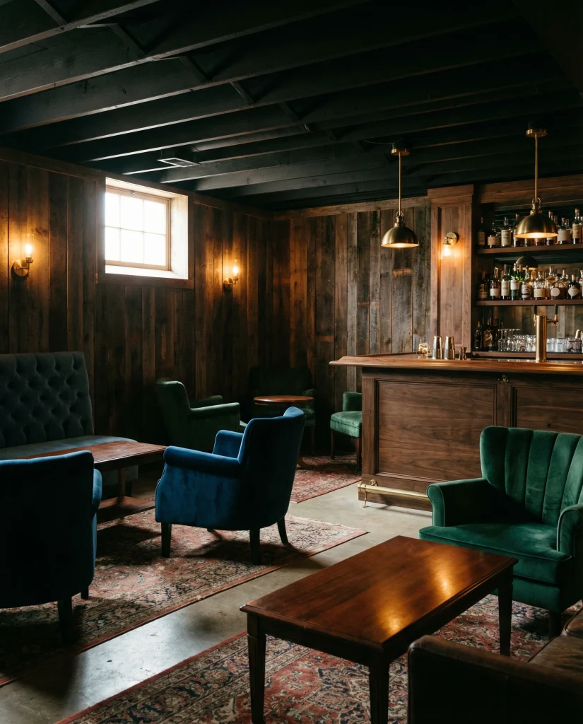 American lifestyle context: Many homeowners use basements as social hubs for gatherings, cards, or evening cocktails. A speakeasy-style corner makes hosting feel special without leaving home.