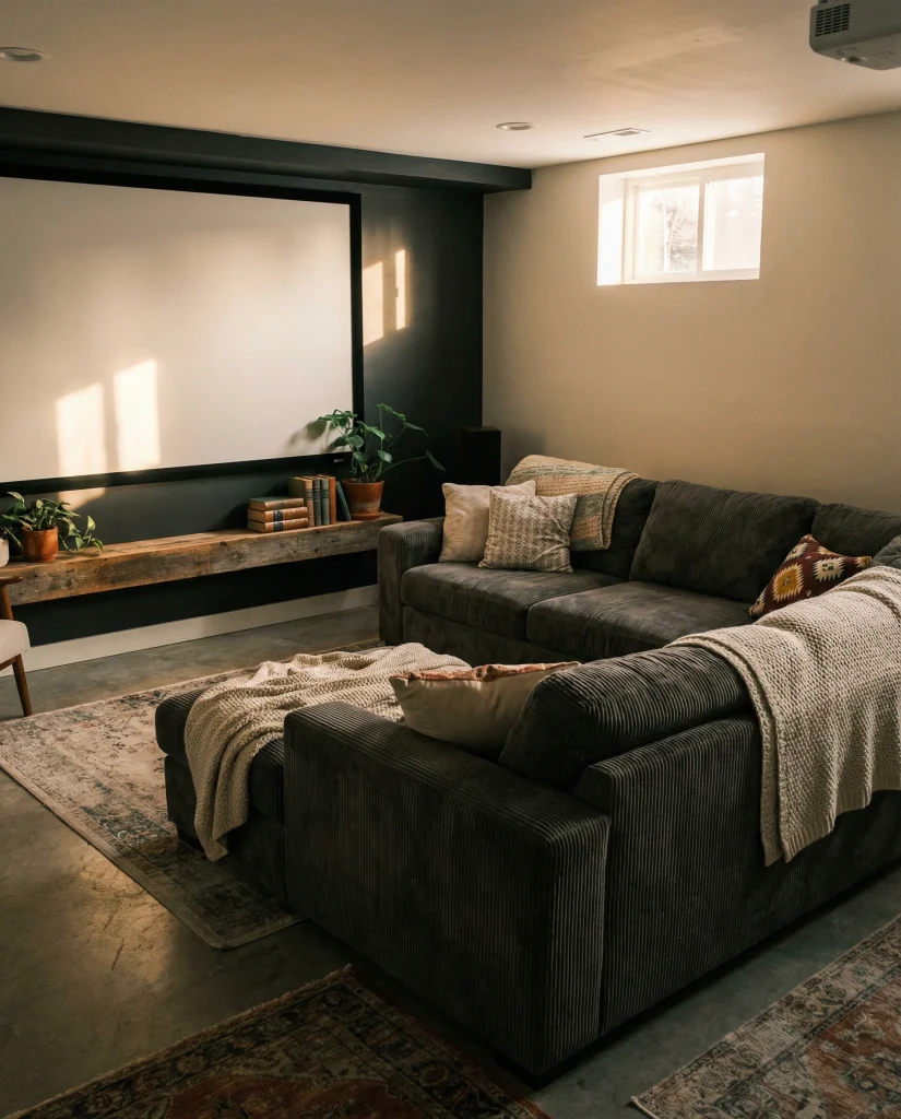 The budget angle makes this setup appealing for first-time homeowners. Paint, secondhand consoles, and a thrifted sectional can deliver the vibe without straining finances while still offering a warm, welcoming place for movie nights.