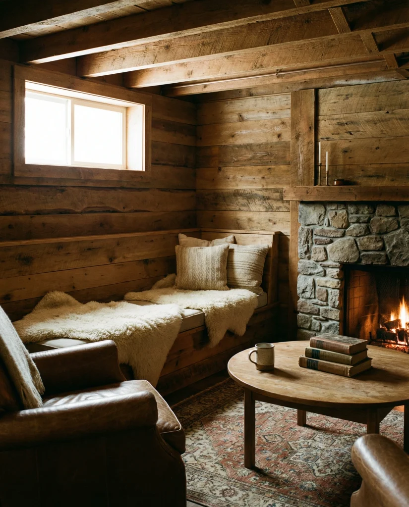 A lodge-inspired corner adds warmth to colder-climate basements, especially in places like Michigan, where the lower level is used year-round. Flexible ideas and layout choices—like angled seating and layered wood tones—make the room feel cozy and grounded.
