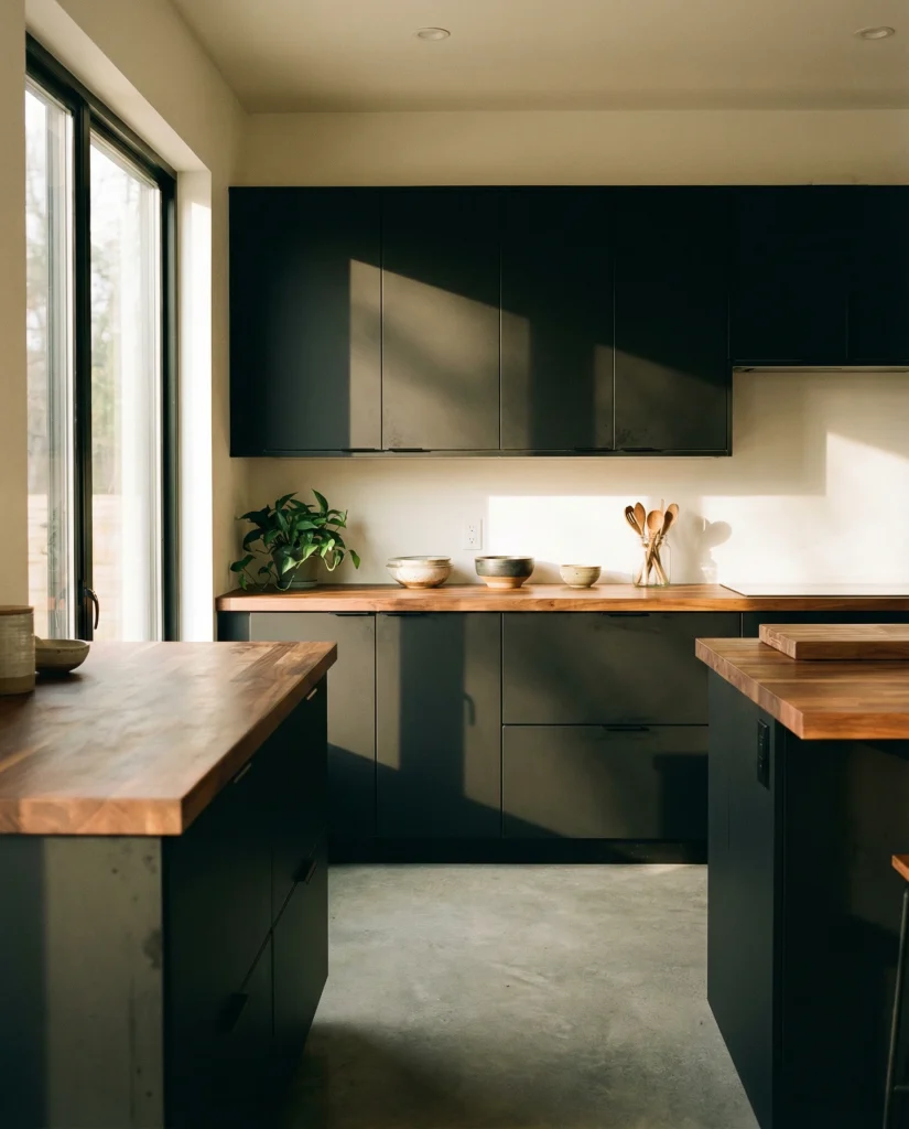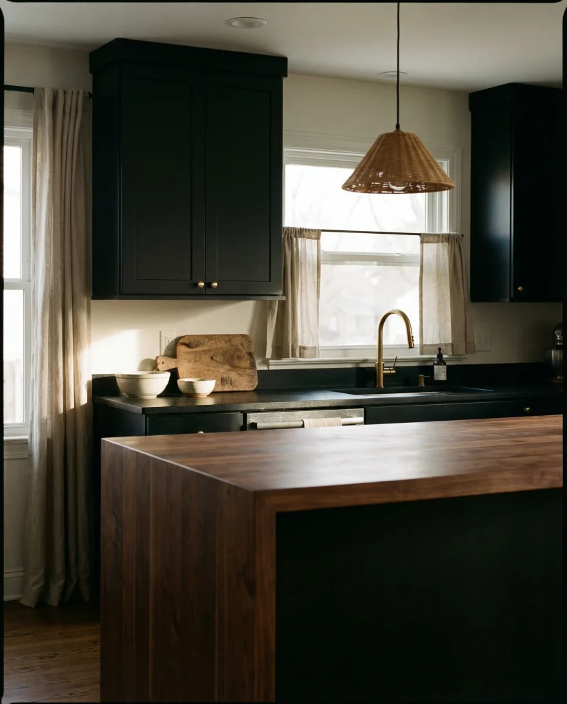Modern black cabinetry becomes more approachable when paired with butcher block surfaces. Whether you’re using butcher block countertops or adding warm wood and highlights, the combination creates a grounded look that feels aligned with current American design preferences—minimalist but homey.