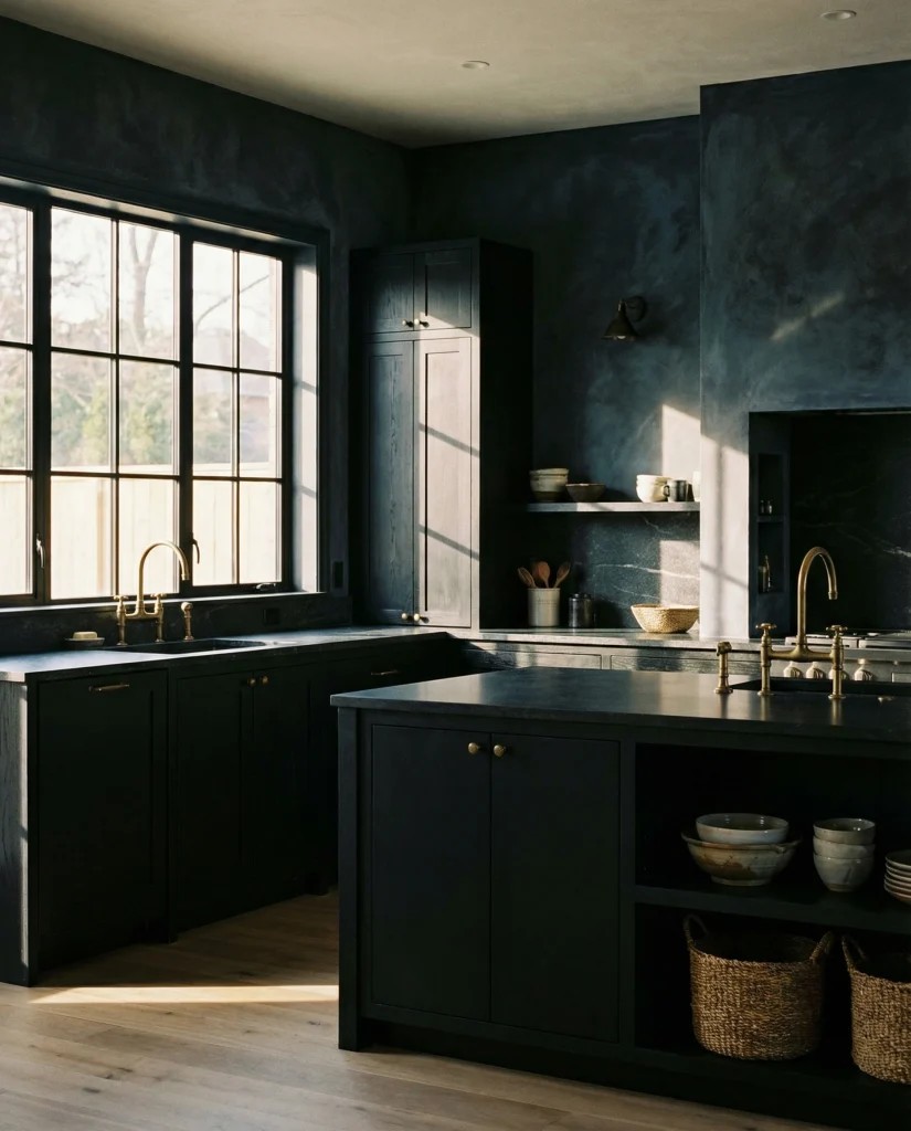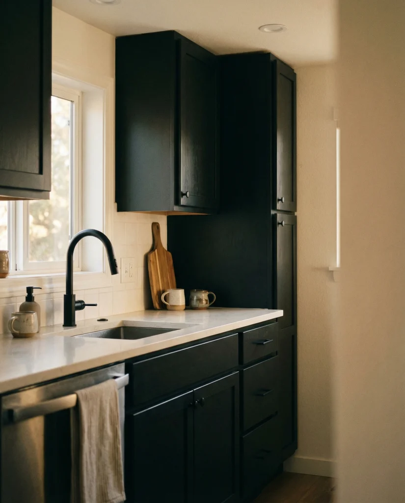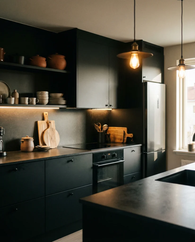 An all-black kitchen can feel surprisingly soft when balanced with moody matte finishes, subtle painted details, and warm colors in lighting. These small adjustments transform a dramatic palette into something comforting and intimate.