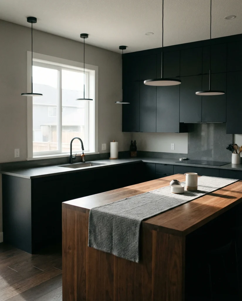 This idea blends bold black cabinetry with warm wood countertops, light white accents, and refined hardware details. The mix creates an atmosphere that feels both lived-in and curated, giving the kitchen an inviting feel while still leaning into dark modern style.