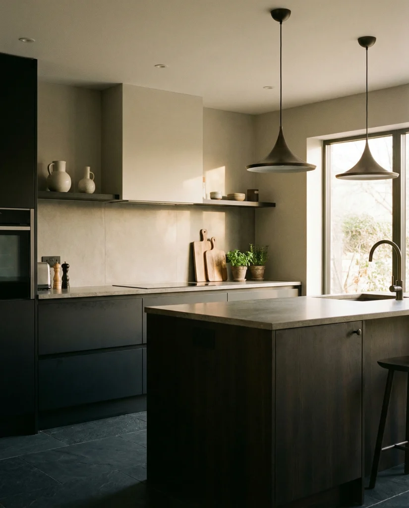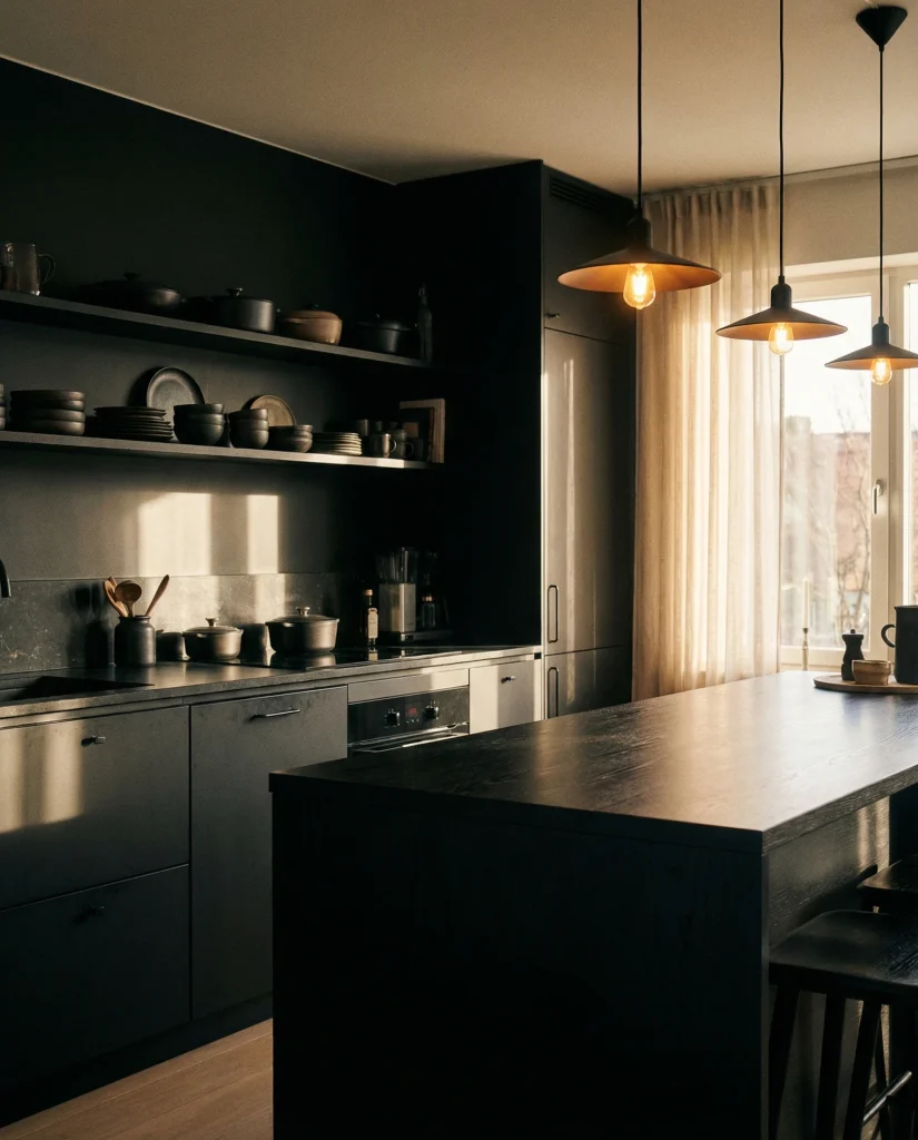 Practical insight: layered lighting—task, ambient, and accent—keeps an all-black kitchen from feeling flat, giving the space depth and dimension throughout the day.