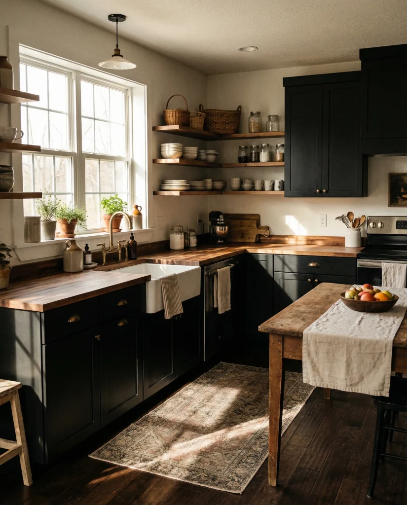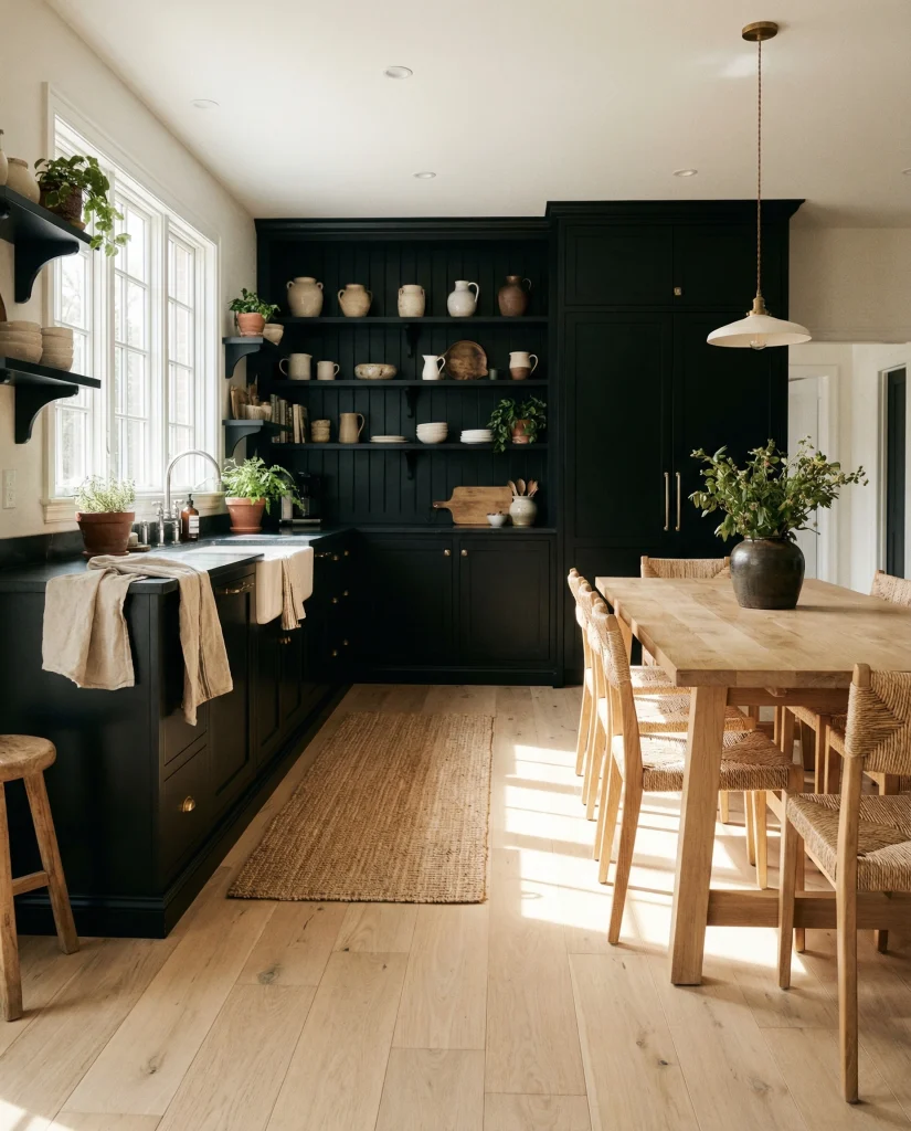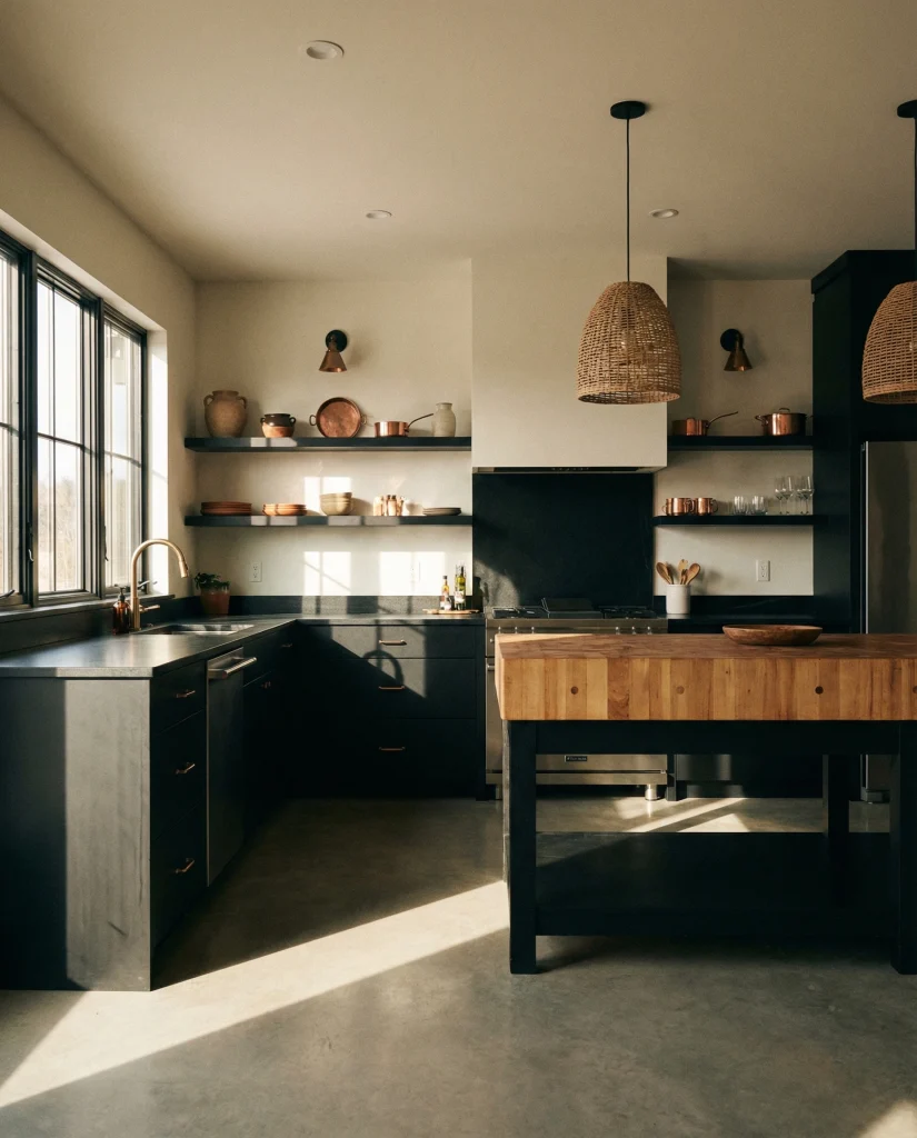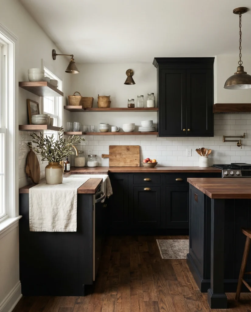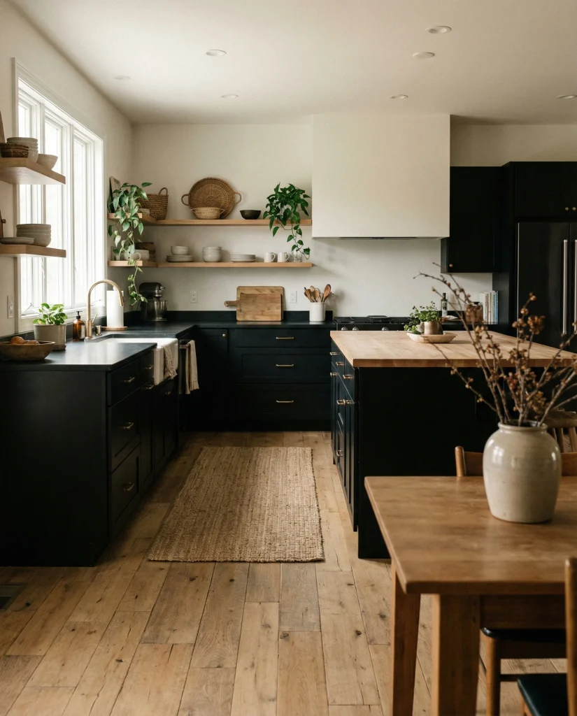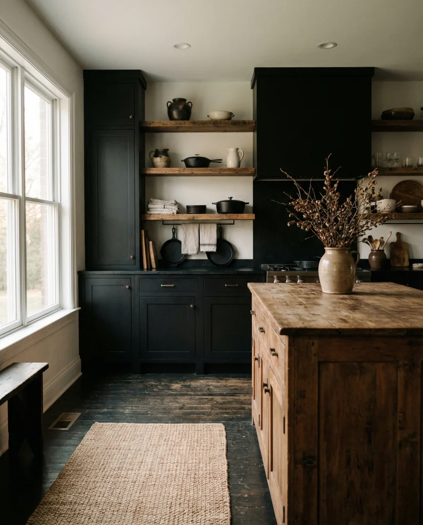 A black kitchen with warm rustic touches—like wood and shelving, butcher block edges, and textured colors—brings a welcoming farmhouse quality. This pairing creates calm contrast: the strength of black meets the comfort of nature-driven materials that soften the entire space.