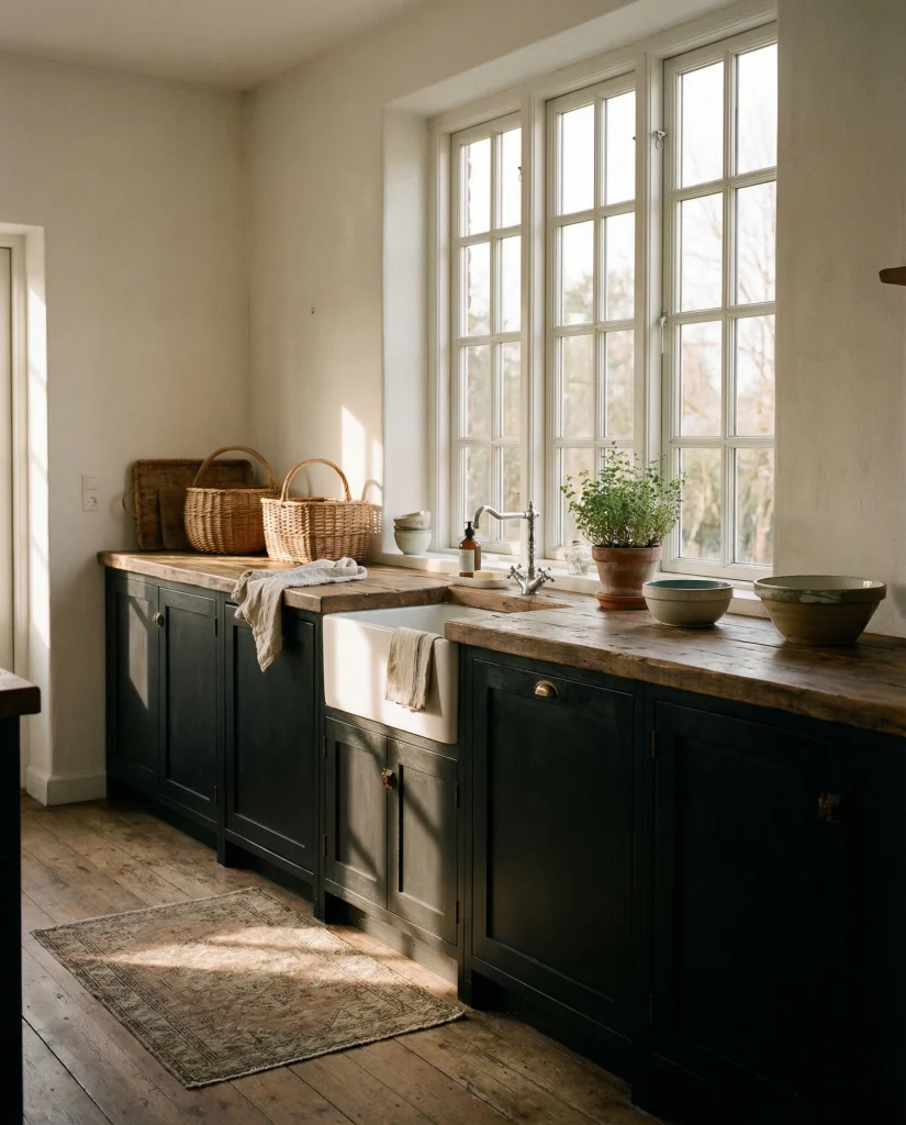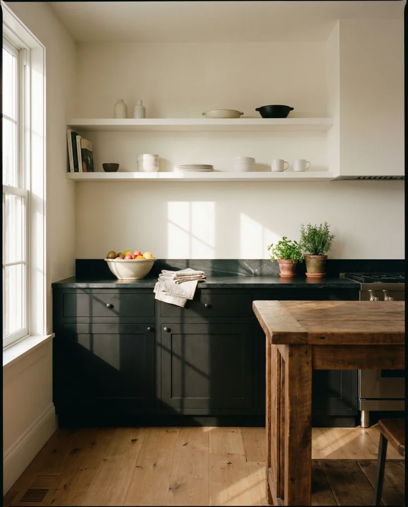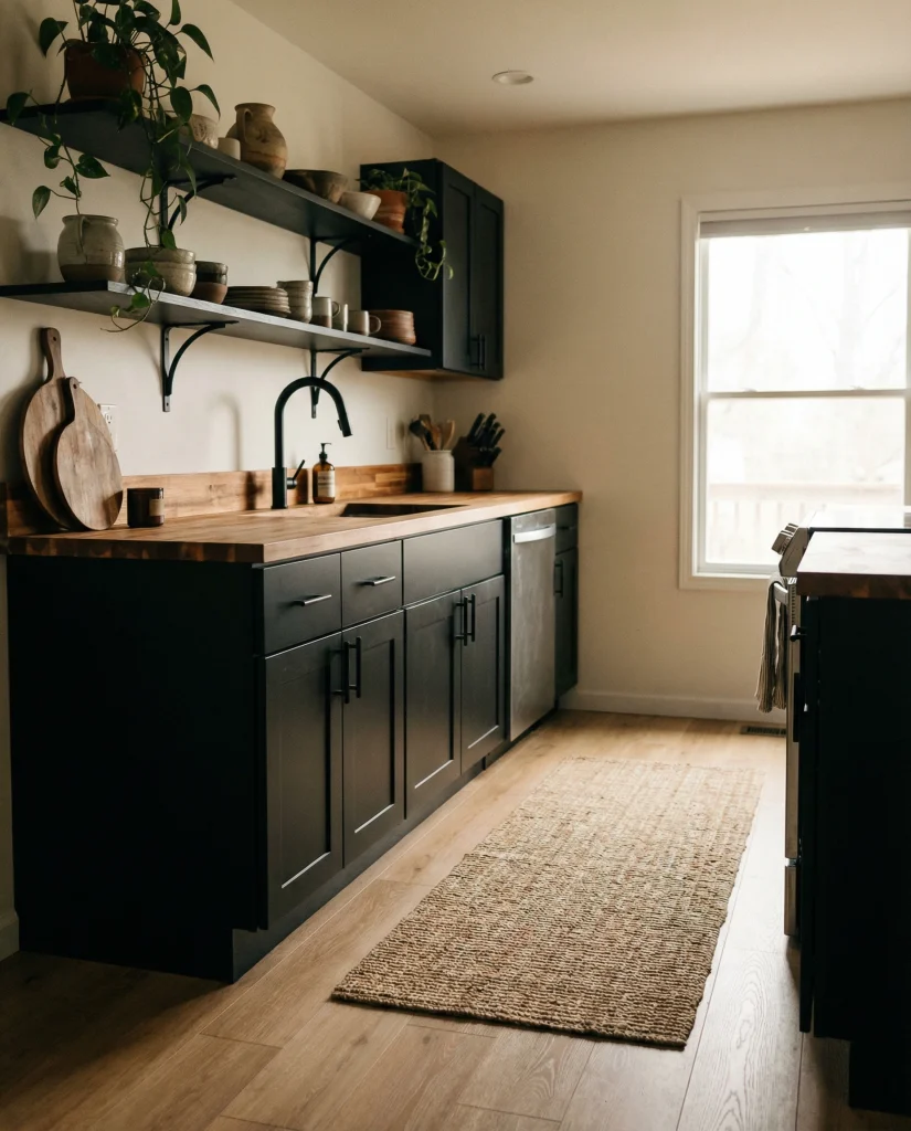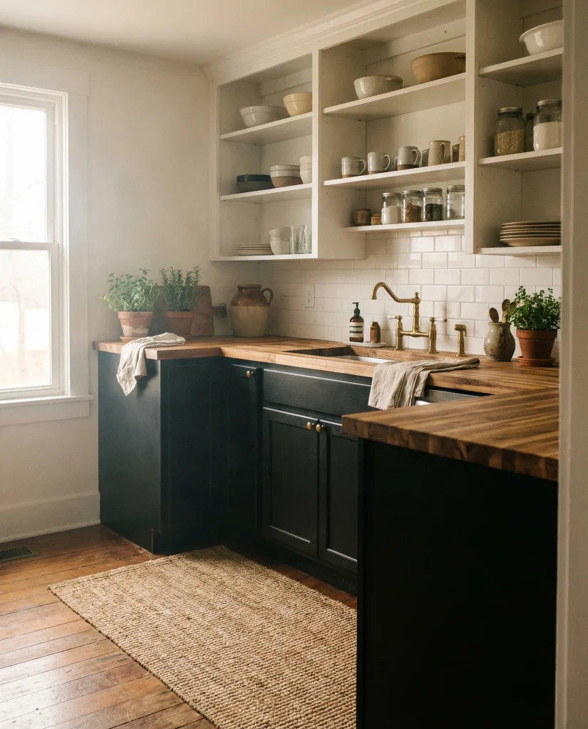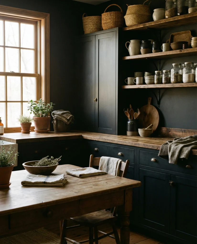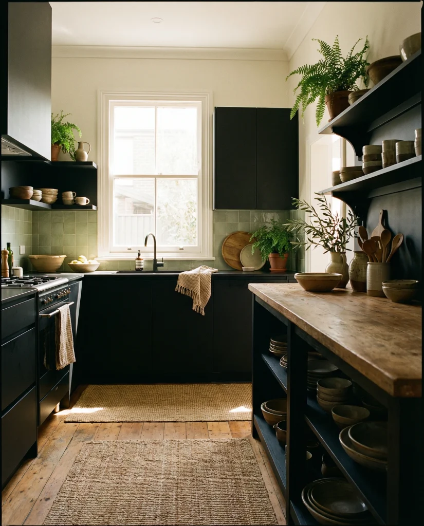 A black kitchen with warm rustic touches—like wood and shelving, butcher block edges, and textured colors—brings a welcoming farmhouse quality. This pairing creates calm contrast: the strength of black meets the comfort of nature-driven materials that soften the entire space.