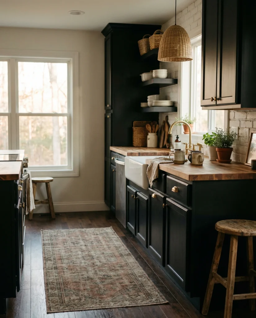 The mix of black cabinetry with warm wood counter surfaces adds natural softness and is perfect for those who love farmhouse influence without leaning overly rustic. Adding thoughtful colors or soft décor makes the room feel balanced, especially when the space includes transitional or updated-lodge styling.