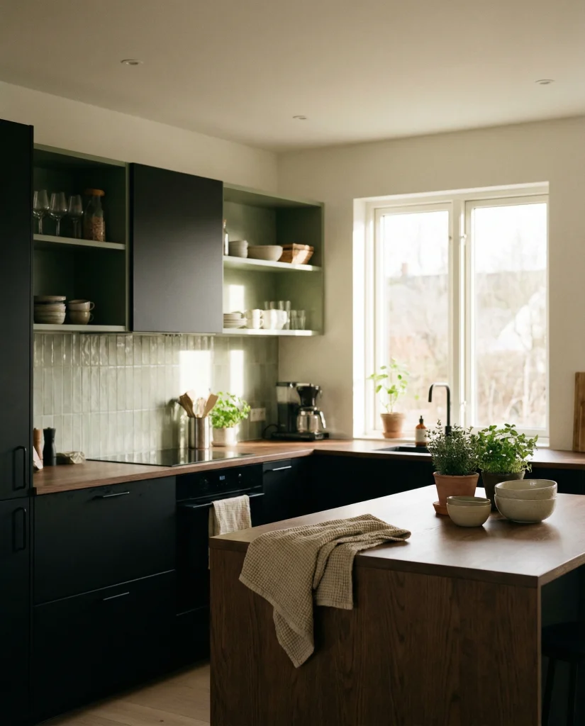 Black cabinetry paired with pale wood and flooring brings a fresh Scandinavian edge. Adding thoughtful traditional details or soft colors keeps the palette harmonious, making the space feel modern yet approachable.