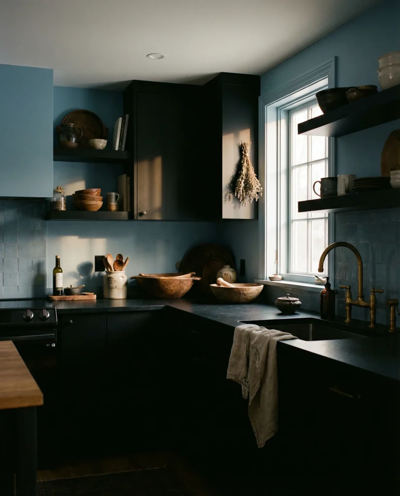 Adding small blue painted elements—like trim or accent cabinets—creates unexpected depth in a black kitchen. Paired with soft painted finishes and thoughtfully chosen ideas, it delivers a subtle sense of color layering that feels modern without being loud.
