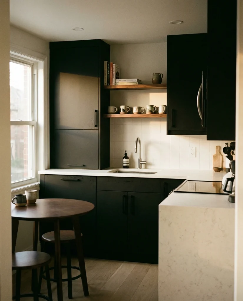 In a small kitchen with dark cabinetry, a white or lighter-toned countertop is favorable, as it contrasts the cabinetry, offsets the darkness, and provides definition without sacrificing brightness to the room. This keeps the layout of the room functional and airy.