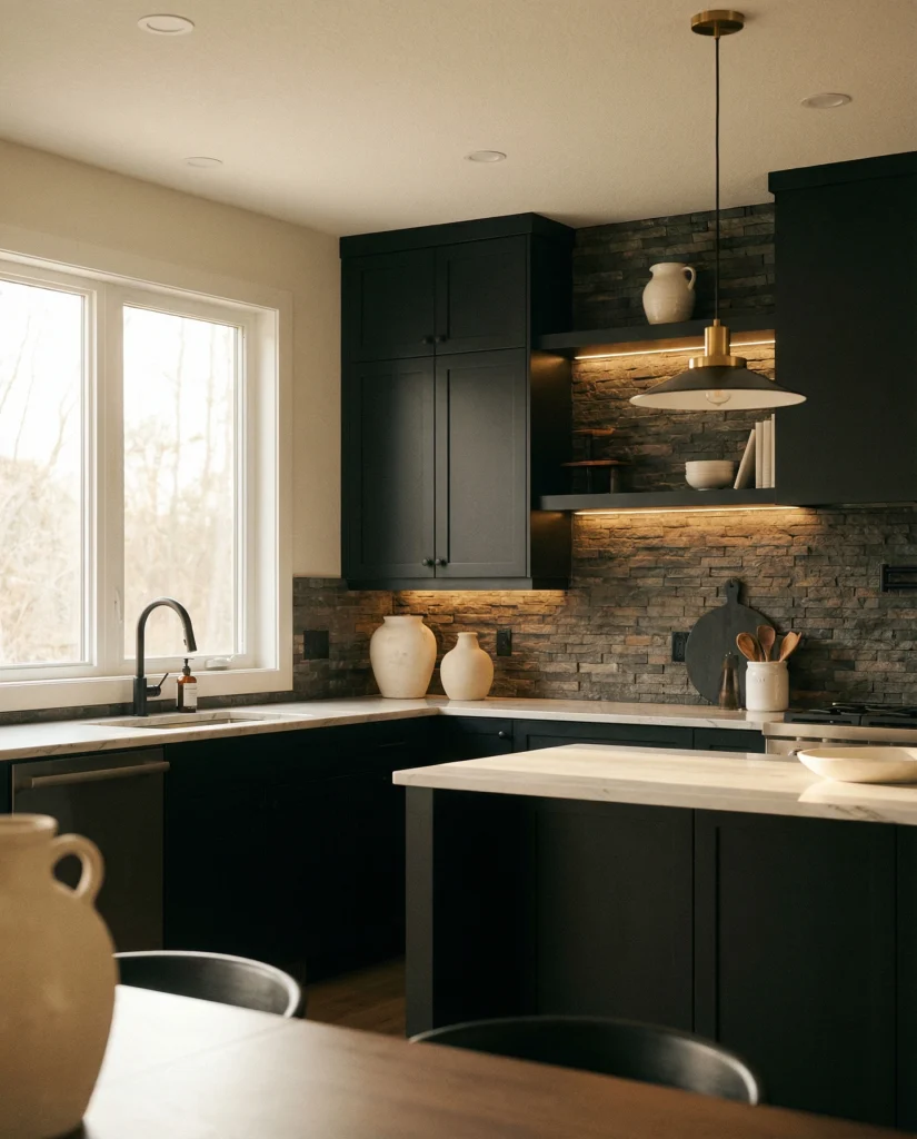Pairing black cabinetry with natural stone details and contrasting black countertops adds depth without visual clutter. Incorporating touches of modern styling—like slim fixtures or streamlined shelving—keeps the whole space feeling refined and current for 2026 design tastes.