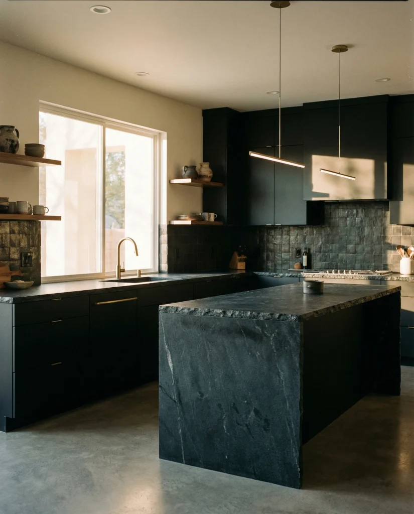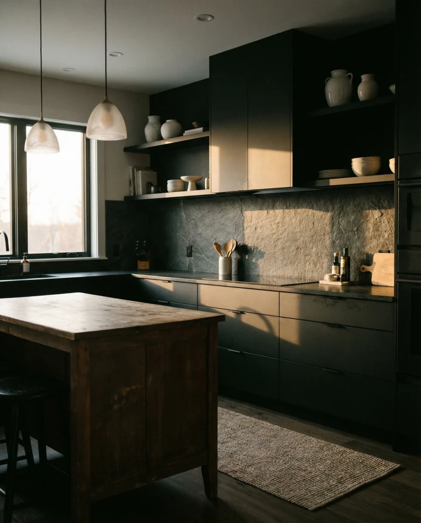 An all-black palette feels surprisingly livable when broken up with gentle blue or neutral undertones, minimal ideas, and strategically placed colors. The key is balancing moody cabinetry with lighting choices that enhance warmth rather than exaggerate darkness.