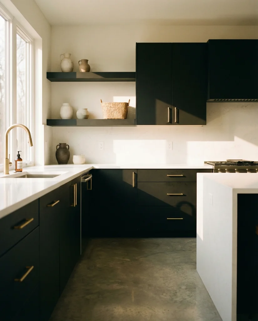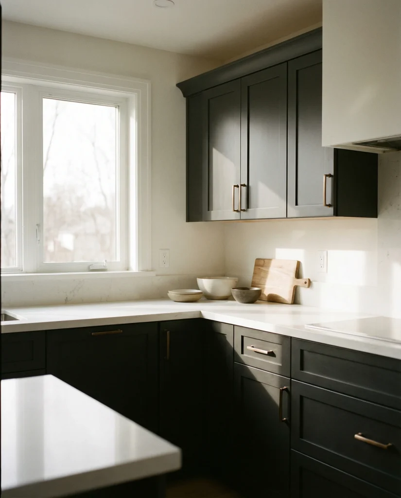 For homeowners wary of going fully dark, pairing black cabinets with crisp white countertops offers the perfect contrast. Layering in subtle hardware details and a touch of decor ideas keeps the palette elevated while maintaining a timeless feel. This mix works beautifully in both traditional and modern interpretations.