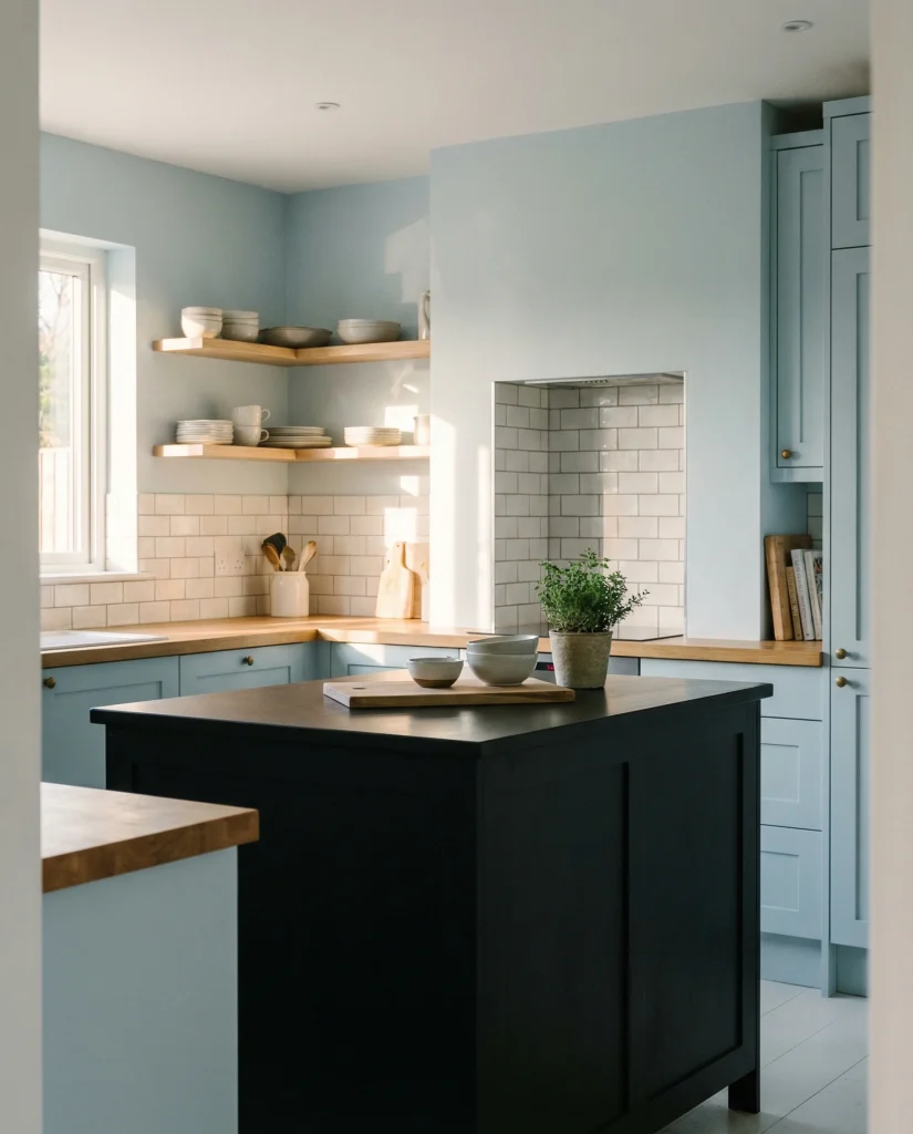 Painting only the island in a small kitchen gives you the drama of black without overwhelming the space. Pairing the island with subtle blue undertones or supporting it with pale backsplash ideas keeps the look balanced. It’s a low-commitment way to test out bold color in compact American homes or rentals.