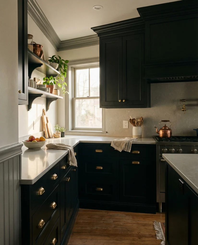 A traditionally styled black kitchen gains sophistication when paired with brushed hardware, refined countertops, and strategic touches of grey. The palette feels classic yet refreshing, especially when moldings or inset cabinetry add structure and architectural character.