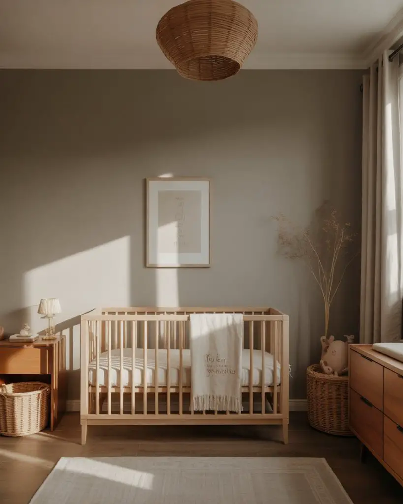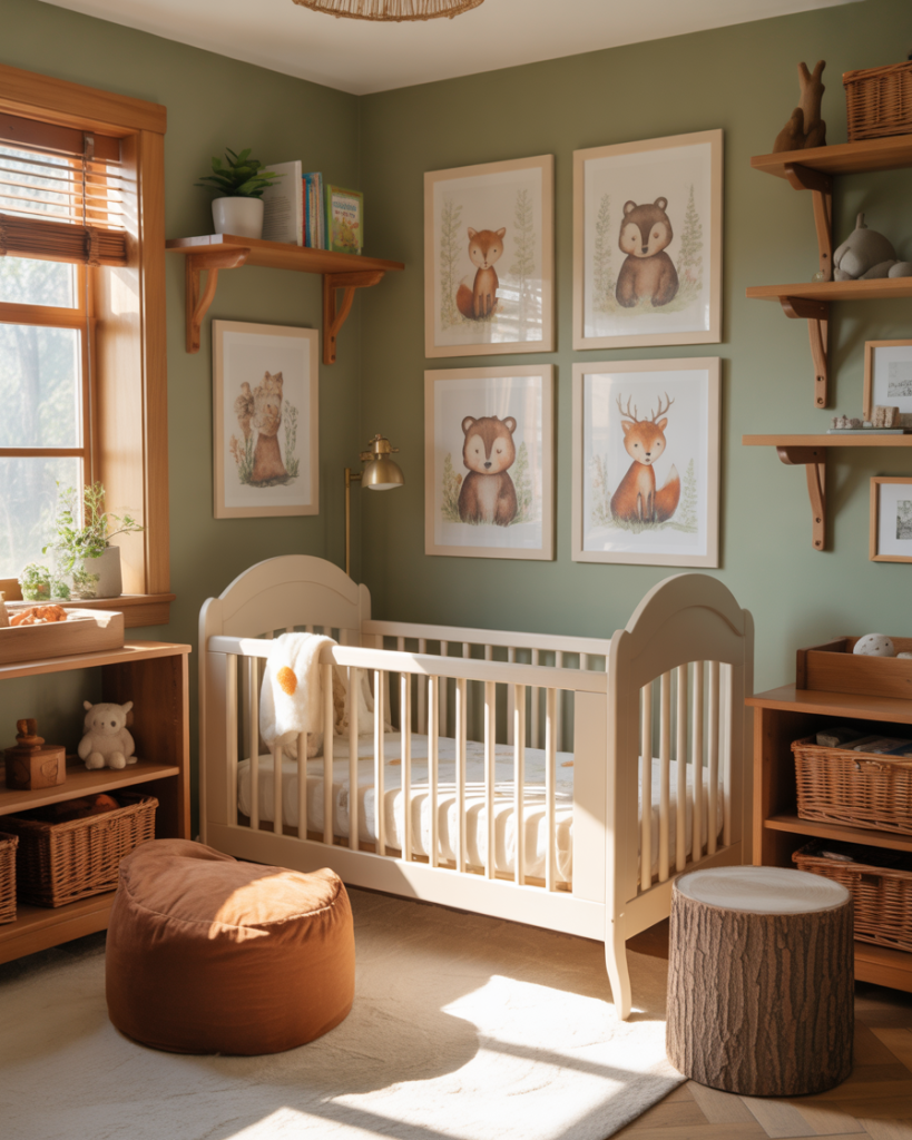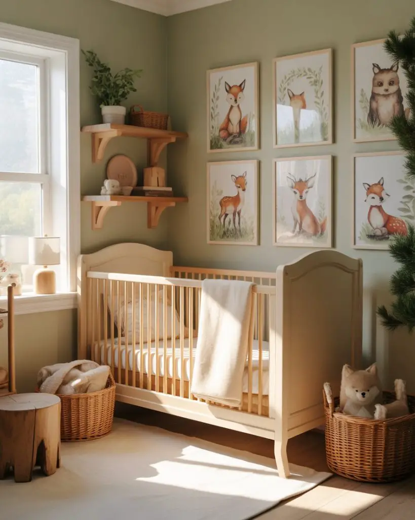 A woodland nursery brings the outdoors inside with earthy tones, tree-inspired wall art, and animal motifs like foxes and deer. This theme works beautifully in homes with plenty of natural light, where soft greens, warm browns, and cream tones create a calming environment. Incorporate nature-themed bedding and wooden toys to complete the look. Parents love this approach because it feels both adventurous and soothing, perfect for a little explorer’s first room.