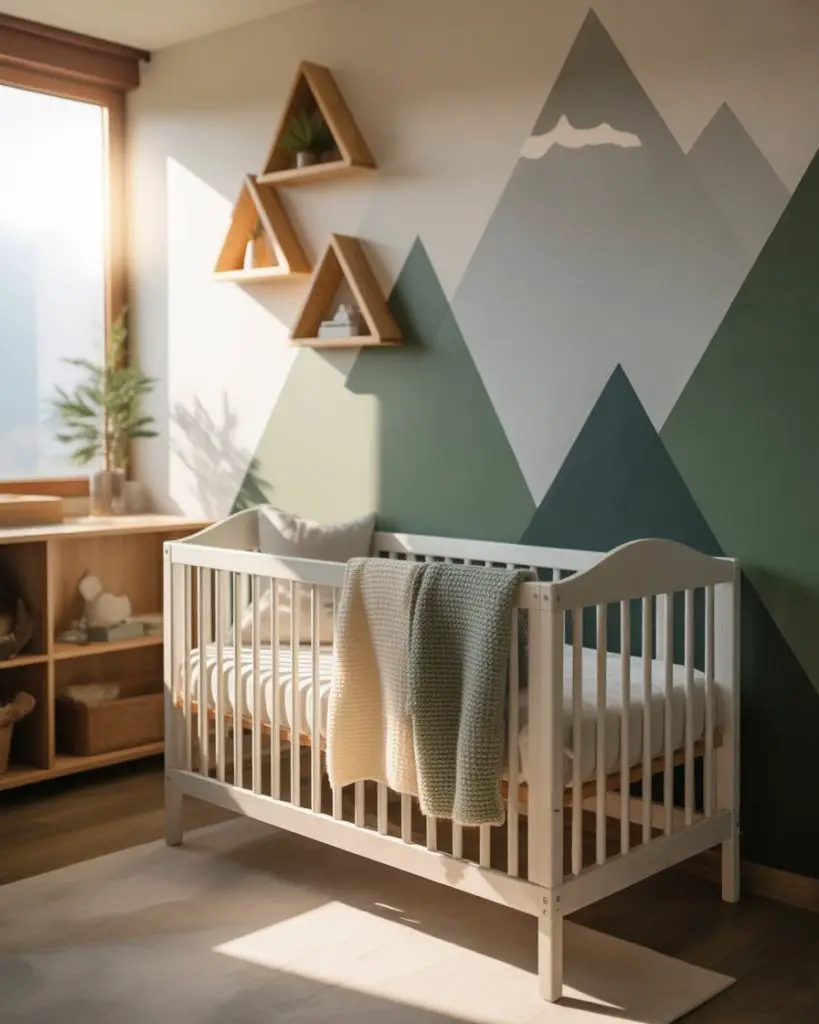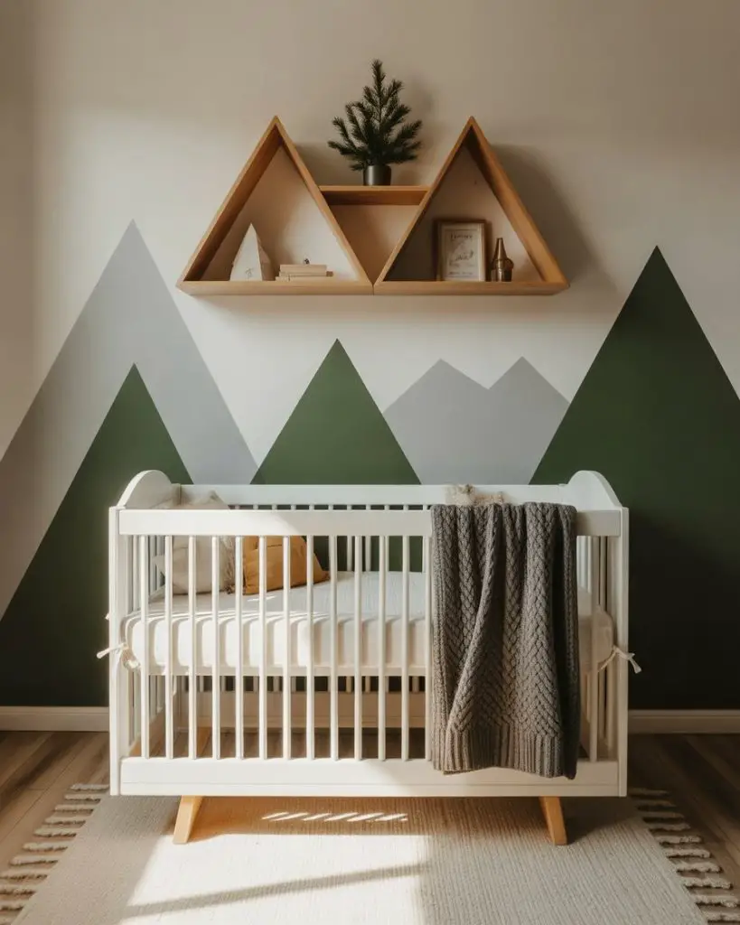 A mountain-themed nursery captures the grandeur of alpine landscapes with triangular mountain murals, evergreen accents, and rustic wood elements. Cool grays, deep greens, and crisp whites create a fresh, modern palette that feels both adventurous and serene. This theme resonates strongly in Western states and among families who value outdoor recreation. The geometric simplicity of mountain shapes makes this an accessible DIY project for parents with basic painting skills.
