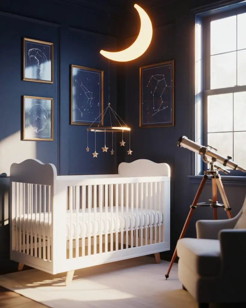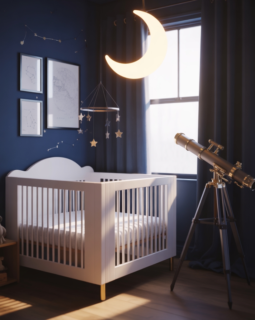 A space-themed nursery launches imagination with stars, planets, and celestial wonders that inspire wonder from day one. Deep navy blues, silvery grays, and touches of gold create a sophisticated take on the traditional space theme. Modern space nurseries move beyond cartoonish rockets, instead embracing realistic constellation maps and elegant planetary art. This theme particularly appeals to parents in tech hubs and academic communities where STEM education begins early.