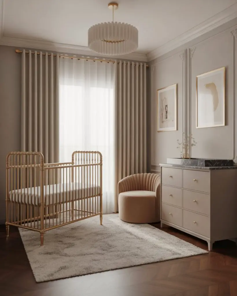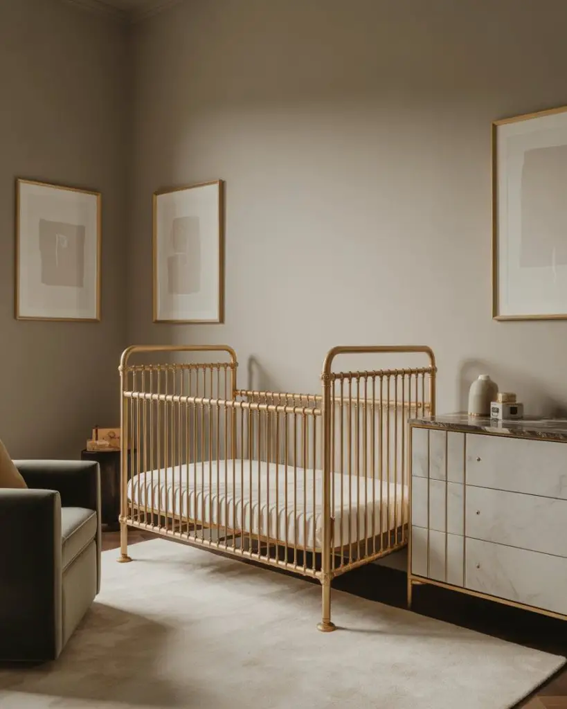 A gold crib serves as the ultimate focal point in a sophisticated nursery, elevating the entire space with metallic elegance. While gold cribs work across many themes, they particularly shine in timeless designs with neutral walls and minimal clutter. Pair with soft grays, warm whites, or even deep navy for maximum impact. This choice appeals to design-conscious parents who want nursery furniture that feels like a worthy investment piece rather than temporary baby gear.