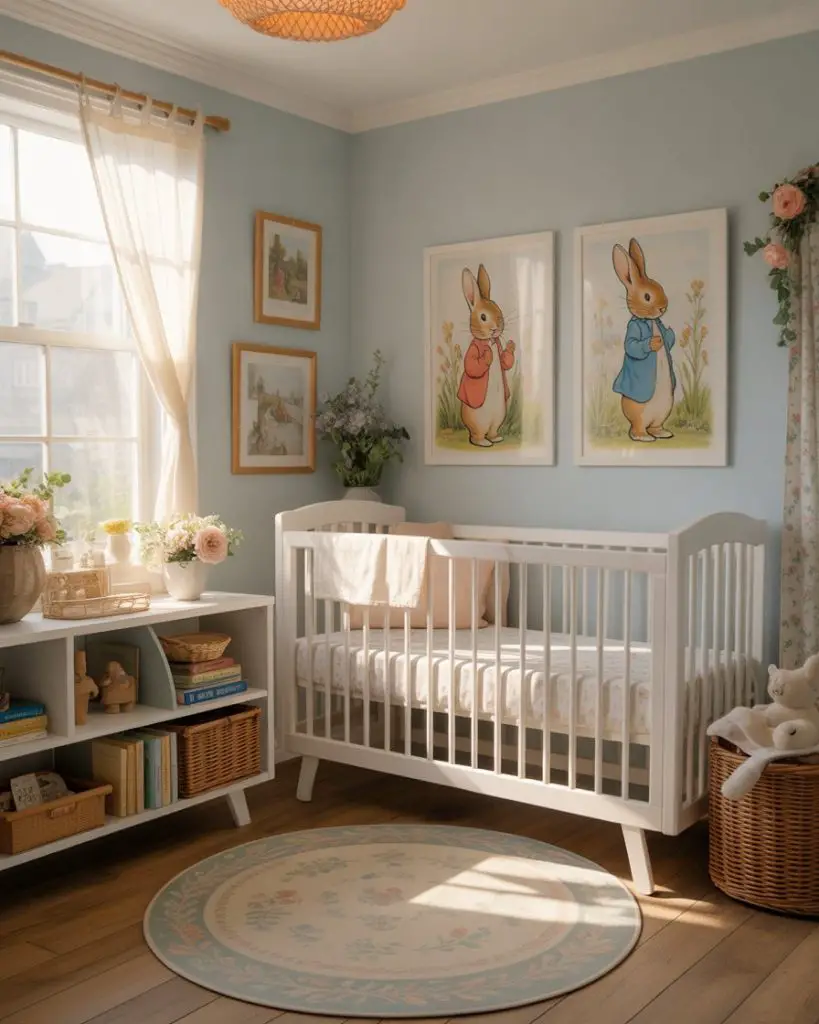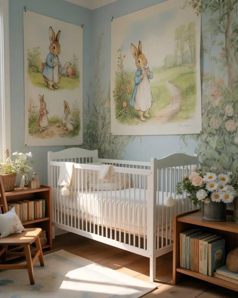 The timeless Peter Rabbit theme brings Beatrix Potter’s beloved world to life with soft blues, garden greens, and classic illustrations. This literary-inspired approach feels both educational and enchanting, perfect for parents who value classic children’s literature. Vintage book prints, vegetable garden motifs, and pastoral landscapes create a gentle English countryside atmosphere. The theme has experienced renewed popularity among American parents seeking alternatives to modern licensed characters.