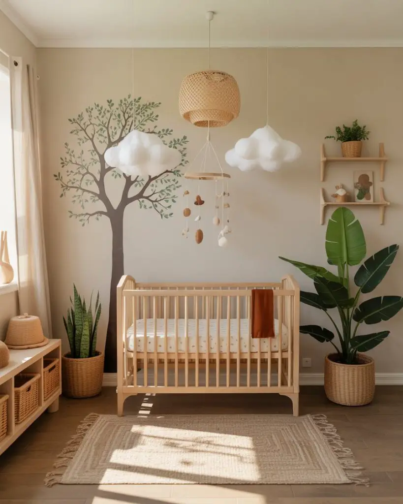 A broad nature-themed nursery celebrates the organic world without committing to a specific subset like woodland or jungle. This flexible approach incorporates trees, clouds, mountains, and animals in a cohesive natural palette. Earthy tones, botanical elements, and timeless designs create a peaceful sanctuary that supports healthy development and calm sleep. This theme particularly resonates with environmentally conscious families who want their child’s first space to reflect their values.