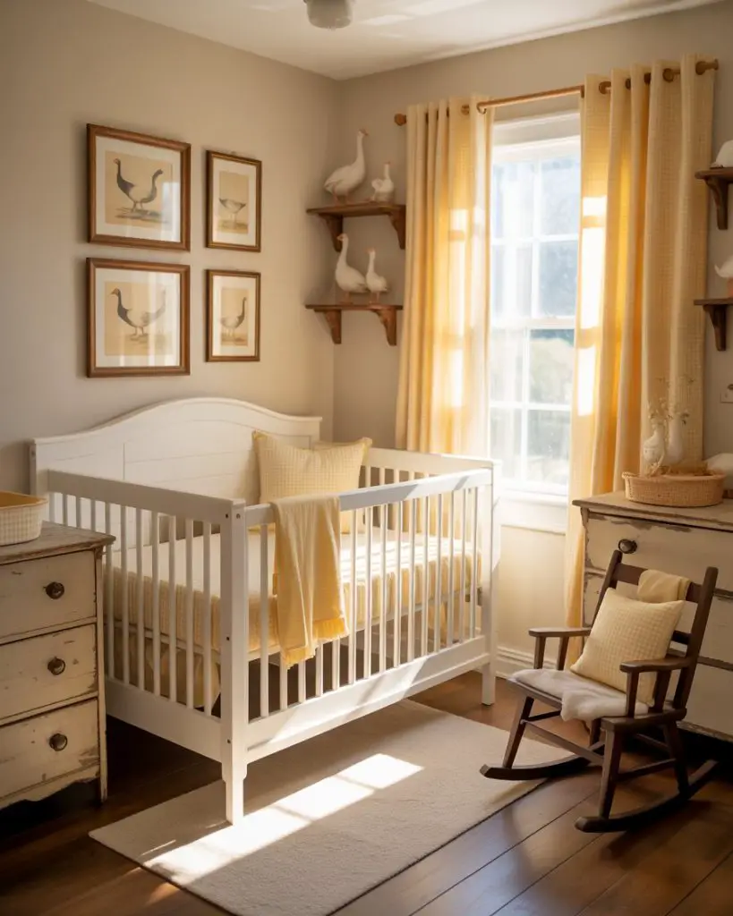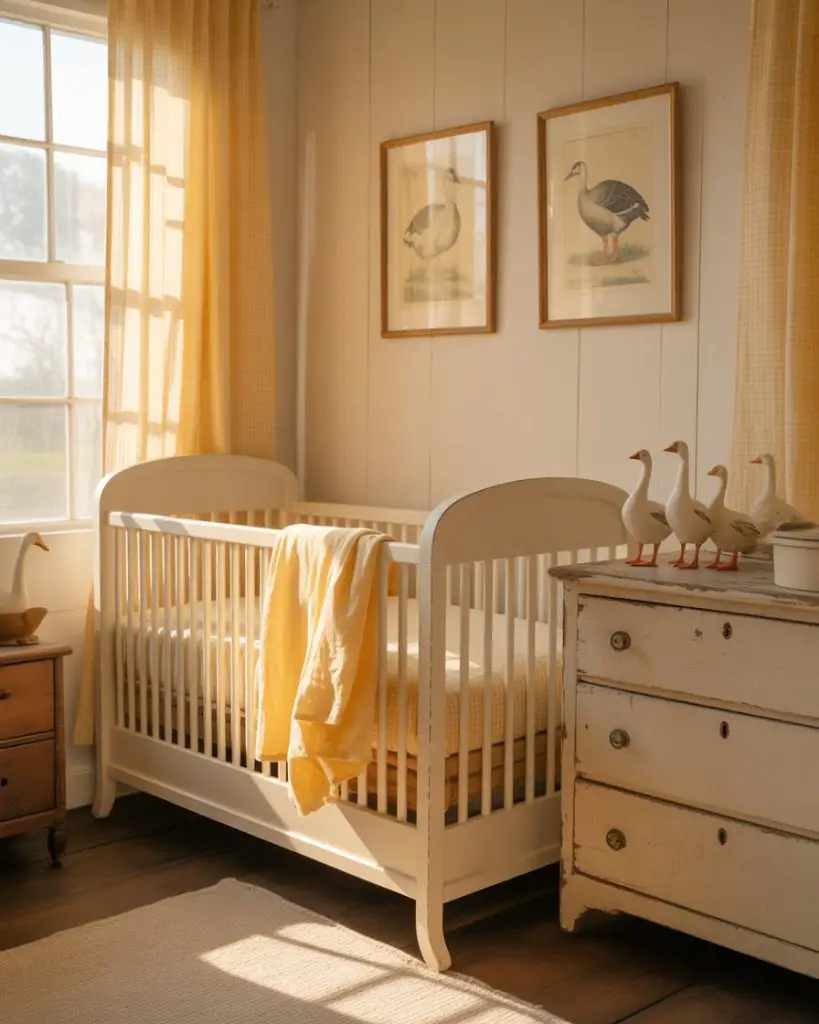 The unexpected goose theme brings quirky charm and vintage appeal to boy nurseries with a playful twist on farmyard aesthetics. White, gray, and soft yellow create a light, airy palette, while goose illustrations and decor add personality without feeling overly cutesy. This theme works particularly well in farmhouse-style homes and appeals to parents seeking something different from typical nursery animals. The simplicity of geese—their clean silhouettes and gentle presence—creates surprisingly sophisticated design opportunities.
