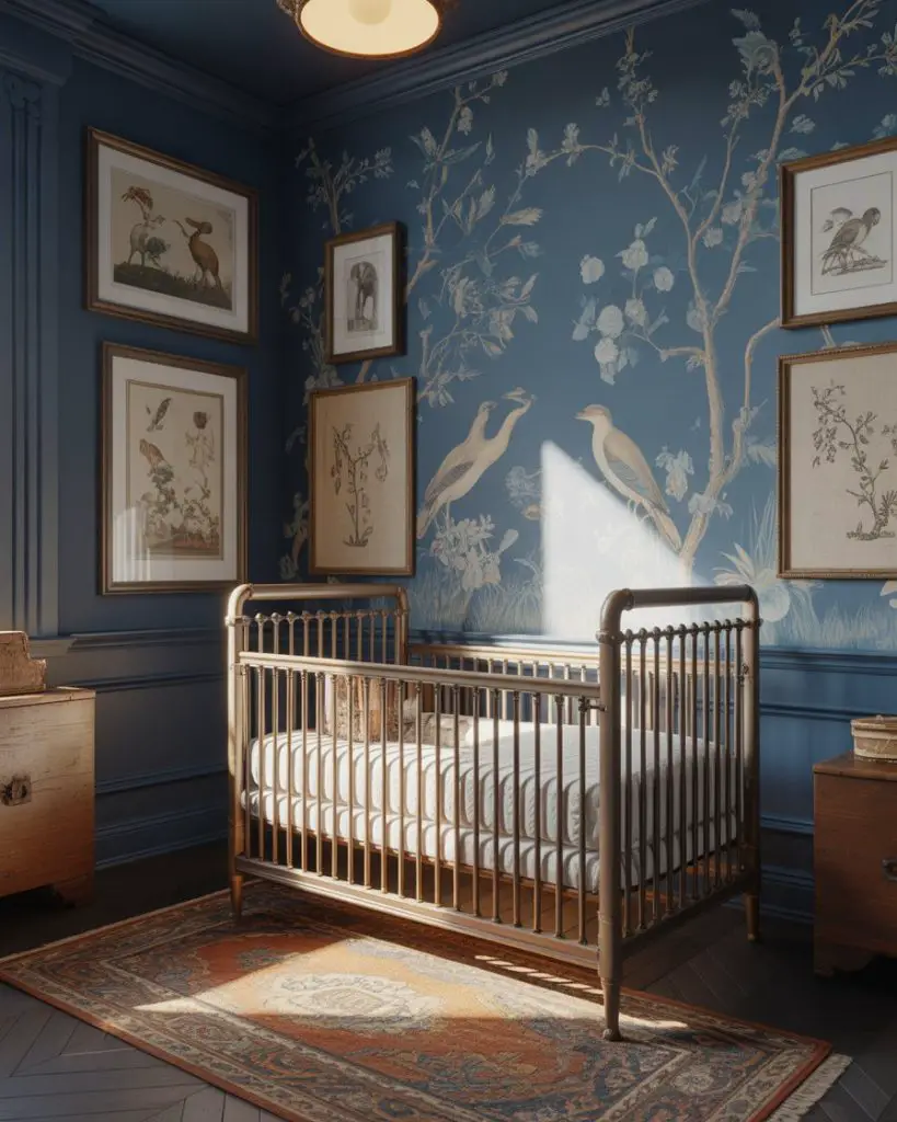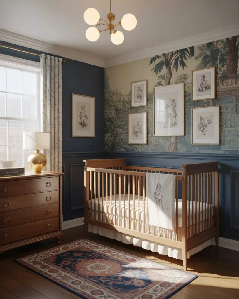The grand millennial style brings traditional design elements into modern nurseries with chinoiserie, classic patterns, and refined antiques that young parents are reclaiming. Think needlepoint pillows, vintage botanical prints, and quality wood furniture with decorative details. This aesthetic appeals to design-savvy millennials who appreciate timeless elegance over fleeting trends. Navy blues, hunter greens, and rich creams create a sophisticated foundation that feels both grown-up and appropriate for a baby’s room.