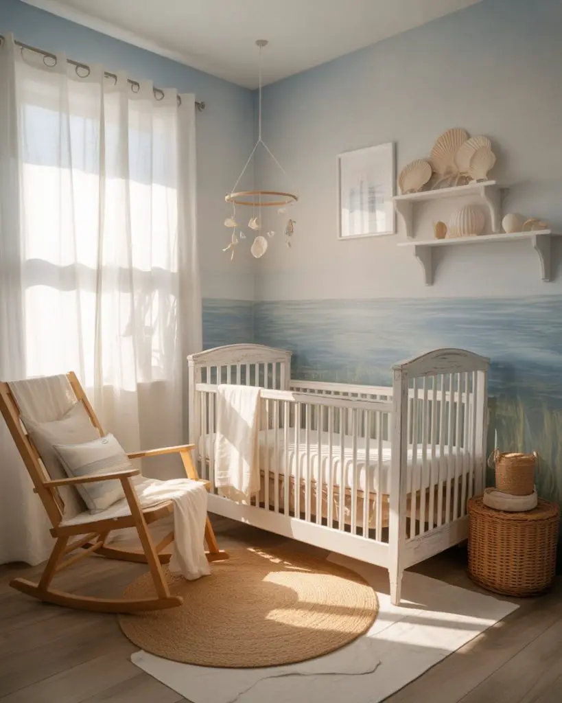 A practical insight: Ocean nurseries benefit from layered lighting that mimics the natural changes in coastal light throughout the day. Install dimmer switches and use a combination of soft overhead lighting, a gentle nightlight, and natural light from sheer curtains to create the same peaceful ambiance you’d find in a beach cottage.