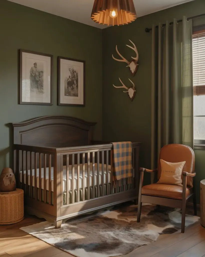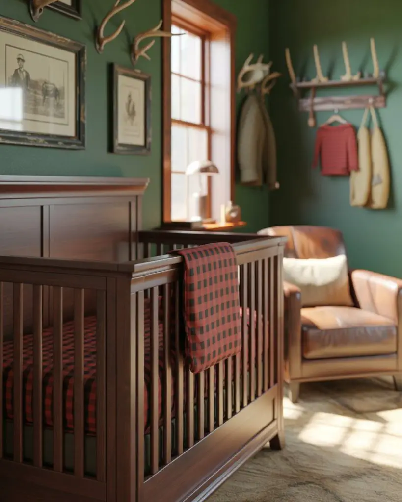 For families who love the outdoors, a hunting theme nursery brings cabin charm and rugged elegance to baby’s first space. Deep greens, rich browns, and plaid accents create a masculine yet sophisticated environment. This style is particularly popular in rural communities and among families with hunting traditions, where passing down outdoor heritage begins early. Buffalo check patterns, deer antler decor, and leather accents add authentic touches without feeling too adult.